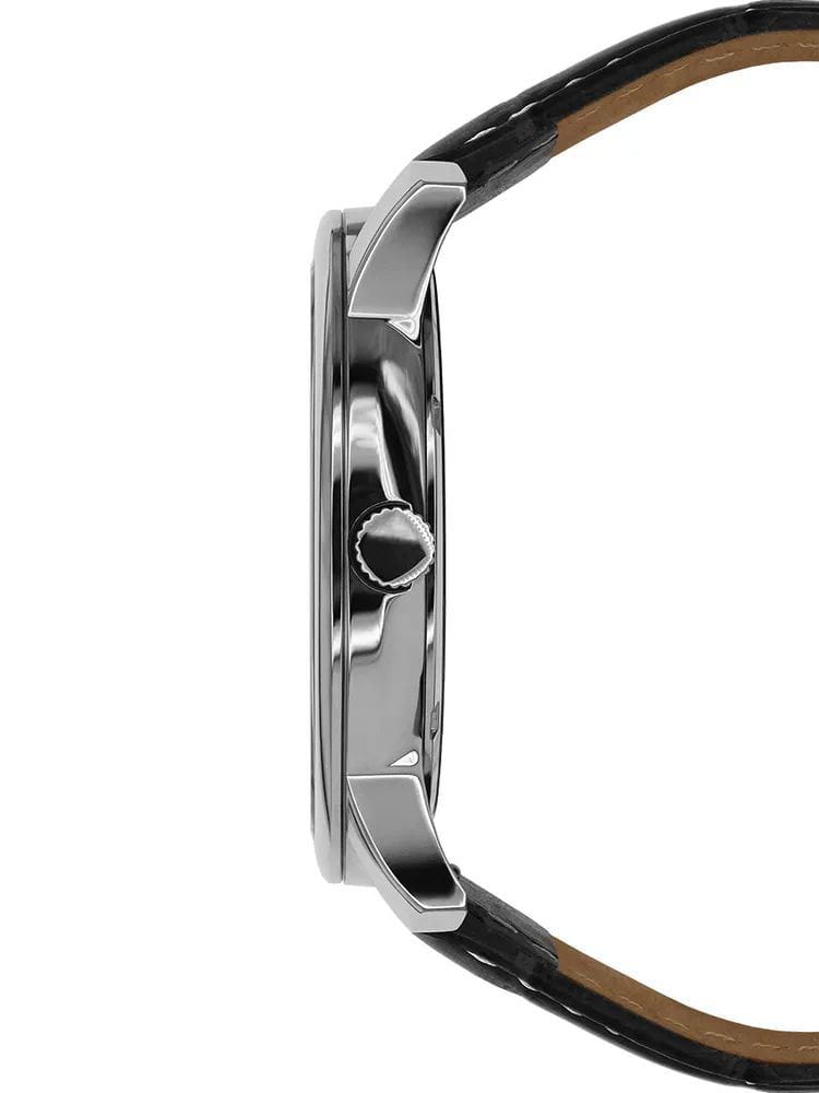 Ремешок выполнен из натуральной кожи чёрного цвета, обеспечивая комфорт при носке.  Толщина корпуса составляет 12 мм, что придаёт часам солидный вид.