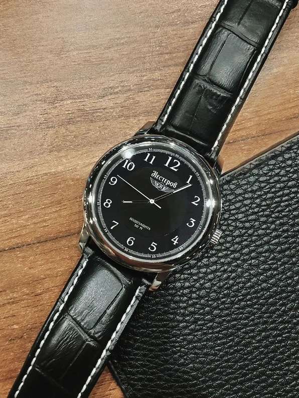 Модель Нестеров H0282B02-01E — это гармоничное сочетание классического дизайна и надёжности, вдохновлённое авиационной тематикой.  Корпус диаметром 44 мм выполнен из нержавеющей стали, подчёркивая прочность и элегантность конструкции.  Чёрный циферблат с арабскими цифрами и стрелками, покрытыми люминесцентным покрытиемЛюминесцентное покрытиеПозволяет считывать показания времени в темноте. Производители наносят на стрелки, часовые индексы, безель или поверхность циферблата светонакопительный состав, дающий холодное свечение., обеспечивает отличную читаемость в любых условиях.