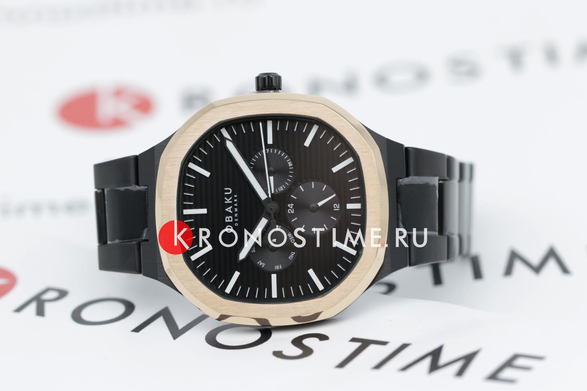 Мужские датские наручные часы Obaku Oktant V275GMMBSB, кварцевый механизм с высокой точностью. Минеральное стеклоМинеральное стеклоМинеральное стекло представляет собой искусственно выращенный минерал кварца. Такое стекло отличается особой устойчивостью к повреждениям и царапинам. Уступает по некоторым качествам сапфировому стеклу. устойчивое к появлению царапин, обладающее высокой прозрачностью. Класс водозащиты: 50 метров, позволит защитить корпус от случайных брызг или капель дождя. Корпус часов изготовлен из стали c IP-покрытиемIP-покрытиеМетод ионного напыления. Демонстрирует повышенную устойчивость к истиранию, окислению и химическим веществам. Под воздействием высокого давления и температуры около 1500°C молекулы металла надёжно соединяются с частицами корпуса часов. черного цвета и частичным покрытием цвета розового золота по безелюБезельВнешний ободок, закрепляющий стекло. В спортивных часах так называется поворотное кольцо с делениями на циферблате, выполняет роль таймера – замеряет отрезки времени на шкале. Неподвижный безель – элемент декора. Однонаправленно вращающийся безель на дайверских часах позволяет фиксировать моменты погружения и выныривания на поверхность.. Застёжка бабочка с кнопкамиЗастёжка "бабочка"Такой вид застёжки дополняется предохранителями, помогающими избежать случайного раскрытия браслета. Обладают изящным исполнением. .