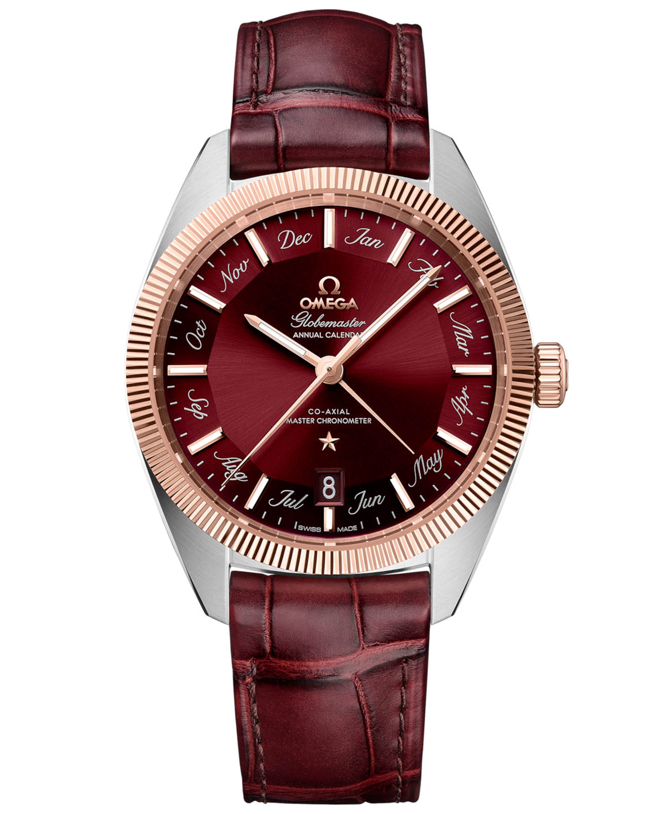 Sedna™, покрытые люминесцентным составомЛюминесцентное покрытиеПозволяет считывать показания времени в темноте. Производители наносят на стрелки, часовые индексы, безель или поверхность циферблата светонакопительный состав, дающий холодное свечение.. Часы с бордовым кожаным ремешком оснащены коаксиальным хронометром OMEGA Master Chronometer Annual Calendar Calibre 8922 с революционной антимагнитной технологией.