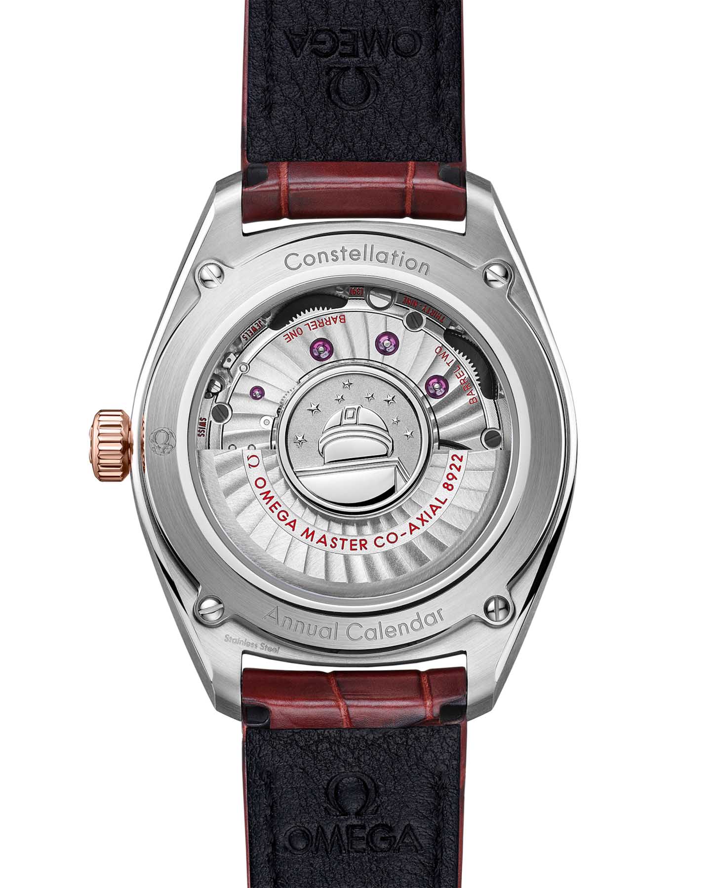 Sedna™. На задней крышке - медальон Центральной обсерватории, помещенный в устойчивое к царапинам сапфировое стеклоСапфировое стеклоПрочный и надёжный материал из кристалла сапфира синтетического происхождения, характеризующийся особой твёрдостью и устойчивостью к царапинам и повреждениям.. Бордовый циферблат «Pie Pan» с солнечными мазками напоминает первую модель 1952 года Constellation. Каждая из его граней включает месяц года в соответствии с функцией годового календаряВечный календарьКлассическое часовое усложнение, представляющее собой календарь, рассчитанный на несколько лет вперёд (стандартно – до 2099 года). Определяет текущую дату, день недели, месяц.. Звезда Constellation и логотип OMEGA выполнены из золота 18 карат18-каратное золотоОбозначение по каратной системе пробирования, оно показывает, сколько драгоценного металла содержится в изделии. 18 карат - в составе 75% чистого золота, соответствует 750 пробе.