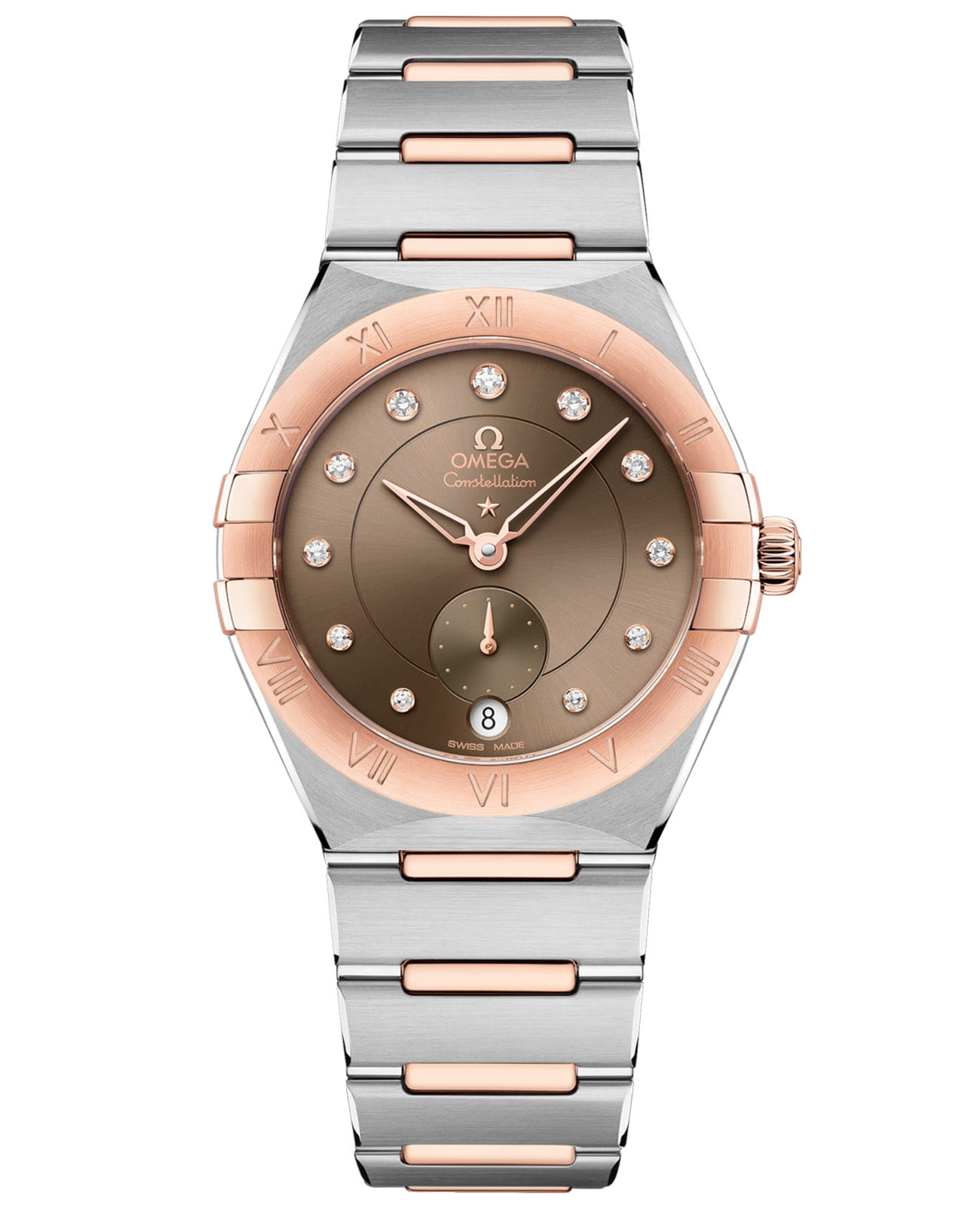 Sedna™ и нержавеющей стали оснащена безелемБезельВнешний ободок, закрепляющий стекло. В спортивных часах так называется поворотное кольцо с делениями на циферблате, выполняет роль таймера – замеряет отрезки времени на шкале. Неподвижный безель – элемент декора. Однонаправленно вращающийся безель на дайверских часах позволяет фиксировать моменты погружения и выныривания на поверхность. с выгравированными римскими цифрами, светло-каштановым циферблатом и круглым окошком даты в положении «6 часов». Инкрементные бриллиантовые часовые индексы представлены в держателях из золота 18K18-каратное золотоОбозначение по каратной системе пробирования, оно показывает, сколько драгоценного металла содержится в изделии. 18 карат - в составе 75% чистого золота, соответствует 750 пробе.