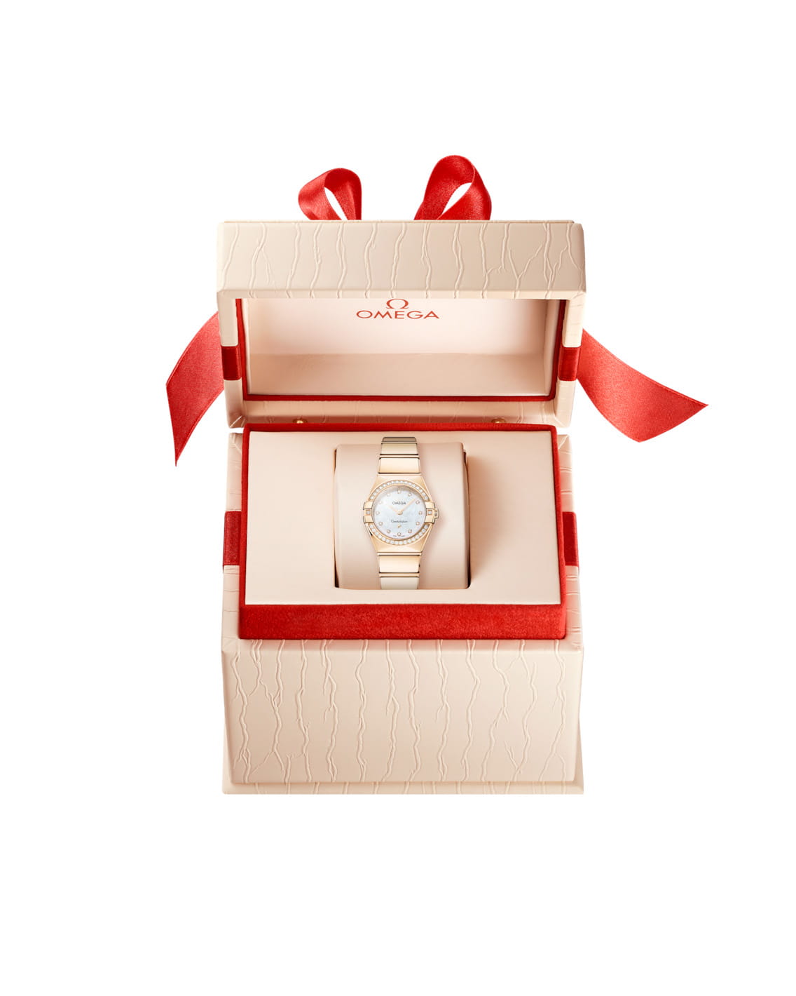 Moonshine™ украшена безелемБезельВнешний ободок, закрепляющий стекло. В спортивных часах так называется поворотное кольцо с делениями на циферблате, выполняет роль таймера – замеряет отрезки времени на шкале. Неподвижный безель – элемент декора. Однонаправленно вращающийся безель на дайверских часах позволяет фиксировать моменты погружения и выныривания на поверхность. с бриллиантовой россыпью, сверкающей подобно россыпи звезд в зимнем небе. Перламутровый циферблат с лазерной гравировкой узора Supernova переливается, словно лунная дорожка на воде, где каждый завиток повторяет танец небесных тел. Стрелки и звезда Constellation из 18-каратного золота18-каратное золотоОбозначение по каратной системе пробирования, оно показывает, сколько драгоценного металла содержится в изделии. 18 карат - в составе 75% чистого золота, соответствует 750 пробе.