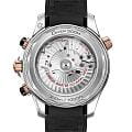 диаметром 44 мм оснащен полированным черным керамическим безелемБезельВнешний ободок, закрепляющий стекло. В спортивных часах так называется поворотное кольцо с делениями на циферблате, выполняет роль таймера – замеряет отрезки времени на шкале. Неподвижный безель – элемент декора. Однонаправленно вращающийся безель на дайверских часах позволяет фиксировать моменты погружения и выныривания на поверхность. с эксклюзивной дайверской шкалой Ceragold™. Керамические кнопки и циферблат украшены изысканным волнообразным узором лазерной гравировки, а на позиции "6 часов" расположено элегантное окошко индикатора даты. Стрелки счетчиков из 18-каратного золота Sedna™18-каратное золотоОбозначение по каратной системе пробирования, оно показывает, сколько драгоценного металла содержится в изделии. 18 карат - в составе 75% чистого золота, соответствует 750 пробе.