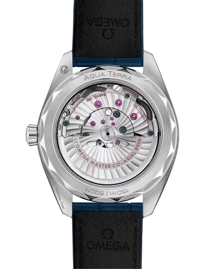 Omega Seamaster Aqua Terra выполнены в симметричном корпусе из нержавеющей стали с завинчивающейся задней крышкой, украшенной волновым узором. Циферблат дополнен окошком даты на 6 часах и оформлен в виде горизонтального рисунка, вдохновлённого текстурой тикового дерева палуб яхт. Стрелки и метки оснащены люминесцентным покрытиемЛюминесцентное покрытиеПозволяет считывать показания времени в темноте. Производители наносят на стрелки, часовые индексы, безель или поверхность циферблата светонакопительный состав, дающий холодное свечение. Super-LumiNova для лучшей читаемости в темноте. Калибр Omega 8900 сертифицирован как Master Chronometer — гарантия высочайшей точности и устойчивости к магнитным полям. Запас хода составляет 60 часов. Защиту циферблата обеспечивает сапфировое стеклоСапфировое стеклоПрочный и надёжный материал из кристалла сапфира синтетического происхождения, характеризующийся особой твёрдостью и устойчивостью к царапинам и повреждениям. с антибликовым покрытиемАнтибликовое покрытиеСлой оксида металла в 0,13-0,3 микрон, благодаря которому стекло часов не бликует и не отражает свет. Антибликовое покрытие уменьшает отражение света в 10 раз, обеспечивая отличную читаемость показателей циферблата.. Водозащита позволяет использовать часы в воде без риска повреждения. Модель поставляется на из кожи аллигатора. Браслетная застежка раскладывается при нажатии кнопок двойной блокировки. Это сочетание премиального качества, технологичности и классического дизайна.