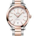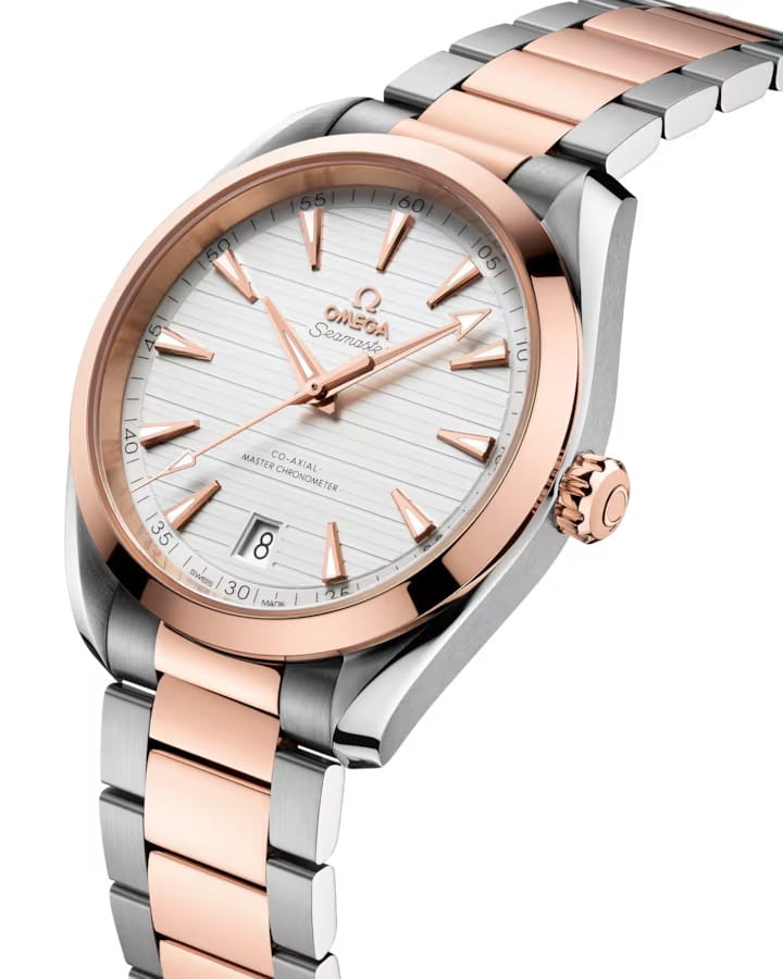 Omega Seamaster Aqua Terra выполнены в симметричном корпусе из нержавеющей стали и золота 18K Moonshine™ с завинчивающейся задней крышкой, декоративным волнистым узором. Циферблат дополнил окошком даты на 6 часов и логотипом OMEGA в центре. Стрелки и метки оснащены Super-LumiNova для лучшей читаемости в темноте. Механизм Калибр Omega 8900 сертифицирован как Master Chronometer — гарантия высочайшей точности и устойчивости к магнитным полям. Запас хода составляет 60 часов. Защита циферблата обеспечивается сапфировое стеклоСапфировое стеклоПрочный и надёжный материал из кристалла сапфира синтетического происхождения, характеризующийся особой твёрдостью и устойчивостью к царапинам и повреждениям. с антибликовым покрытиемАнтибликовое покрытиеСлой оксида металла в 0,13-0,3 микрон, благодаря которому стекло часов не бликует и не отражает свет. Антибликовое покрытие уменьшает отражение света в 10 раз, обеспечивая отличную читаемость показателей циферблата.. Водозащита Позволяет использовать часы в воде без повреждений. Часы установлены на интегрированном браслете с полированными и матовыми звеньями. Это сочетание премиального качества, технологичности и классического дизайна.