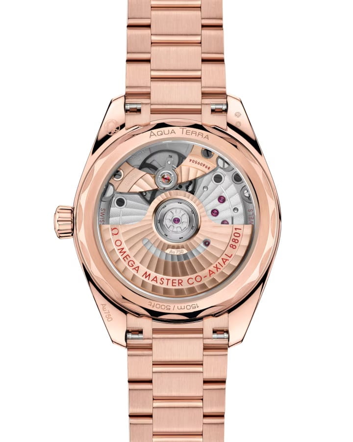 Часы Omega Seamaster Aqua Terra выполнены в симметричном корпусе из полированного 18K Sedna™ золота с завинчивающейся задней крышкой, украшенной волновым узором. Модель дополнена конической заводной головкой и окошком даты на 6 часах, окаймлённым кольцом из 18K Sedna™ золота. Циферблат выполнен по технологии linen и покрыт слоем PVD для повышения стойкости цвета. Он оформлен с использованием люминесцентного покрытияЛюминесцентное покрытиеПозволяет считывать показания времени в темноте. Производители наносят на стрелки, часовые индексы, безель или поверхность циферблата светонакопительный состав, дающий холодное свечение. Super-LumiNova, что обеспечивает отличную читаемость в темноте. Стрелки и индексы в форме корпусов парусников подчёркивают морское наследие коллекции. Калибр Omega 8801 сертифицирован как Master Chronometer — гарантия высочайшей точности и устойчивости к магнитным полям. Запас хода составляет 55 часов. Защиту циферблата обеспечивает сапфировое стеклоСапфировое стеклоПрочный и надёжный материал из кристалла сапфира синтетического происхождения, характеризующийся особой твёрдостью и устойчивостью к царапинам и повреждениям. с антибликовым покрытиемАнтибликовое покрытиеСлой оксида металла в 0,13-0,3 микрон, благодаря которому стекло часов не бликует и не отражает свет. Антибликовое покрытие уменьшает отражение света в 10 раз, обеспечивая отличную читаемость показателей циферблата. с обеих сторон. Водозащита позволяет использовать часы в воде без риска повреждения. Часы установлены на браслет из 18K Sedna™ золота с раскладной застёжкойРаскладная застёжкаТакой тип застёжки используется только на браслетах из металла. Она никогда не раскрывается полностью, происходит разделение на 2 и более частей. Раскладывающая застёжка снизит вероятность потери часов к минимуму.. Это сочетание премиального качества, технологичности и классического дизайна.