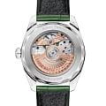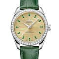 Omega Seamaster Aqua Terra выполнены в симметричном корпусе из 18K Canopus Gold™ — устойчивом к выцветанию и потускнению сплаве, сочетающем прочность и благородный внешний вид. Задняя крышка украшена волновым рисунком, отсылающим к морскому наследию коллекции. Циферблат дополнен окошком даты и оформлен уникальным волновым рисунком, созданным методом wire bonding — технологией, заимствованной из микроэлектроники. Основа циферблата изготовлена из 18K золота и покрыта PVD для стойкости цвета. Часовые метки представлены тсаваритами, а стрелки выполнены из белого золота и оснащены люминесцентным покрытиемЛюминесцентное покрытиеПозволяет считывать показания времени в темноте. Производители наносят на стрелки, часовые индексы, безель или поверхность циферблата светонакопительный состав, дающий холодное свечение. Super-LumiNova для лучшей читаемости в темноте. Калибр Omega 8807 сертифицирован как Master Chronometer — гарантия высочайшей точности и устойчивости к магнитным полям. Запас хода составляет 55 часов. Защиту циферблата обеспечивает сапфировое стеклоСапфировое стеклоПрочный и надёжный материал из кристалла сапфира синтетического происхождения, характеризующийся особой твёрдостью и устойчивостью к царапинам и повреждениям. с антибликовым покрытиемАнтибликовое покрытиеСлой оксида металла в 0,13-0,3 микрон, благодаря которому стекло часов не бликует и не отражает свет. Антибликовое покрытие уменьшает отражение света в 10 раз, обеспечивая отличную читаемость показателей циферблата. с обеих сторон. Водозащита позволяет использовать часы в воде без риска повреждения. Часы установлены на кожаный ремешок изумрудного цвета. Это сочетание премиального качества, технологичности и классического дизайна.