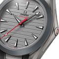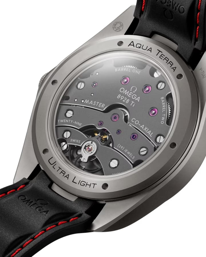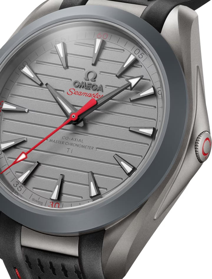 Omega Seamaster Aqua Terra выполнены в корпусе из авиационного титана Gamma Titanium, что делает их исключительно лёгкими. Модель оснащена завинчивающейся задней крышкой с прозрачным окном и винтовой заводной головкой с телескопической конструкцией для защиты от случайного открытия. Циферблат дополнен окошком даты и оформлен горизонтальным рисунком, вдохновлённым текстурой тикового дерева палуб яхт. Секундная стрелка выделена насыщенным красным цветом, а стрелки и метки оснащены люминесцентным покрытиемЛюминесцентное покрытиеПозволяет считывать показания времени в темноте. Производители наносят на стрелки, часовые индексы, безель или поверхность циферблата светонакопительный состав, дающий холодное свечение. Super-LumiNova для лучшей читаемости в темноте. Калибр Omega 8928 Ti — первый в истории Omega, выполненный полностью из титана. Он сертифицирован как Master Chronometer, что гарантирует высочайшую точность и устойчивость к магнитным полям. Запас хода составляет 72 часа. тЗащиту циферблата обеспечивает сапфировое стеклоСапфировое стеклоПрочный и надёжный материал из кристалла сапфира синтетического происхождения, характеризующийся особой твёрдостью и устойчивостью к царапинам и повреждениям. с антибликовым покрытиемАнтибликовое покрытиеСлой оксида металла в 0,13-0,3 микрон, благодаря которому стекло часов не бликует и не отражает свет. Антибликовое покрытие уменьшает отражение света в 10 раз, обеспечивая отличную читаемость показателей циферблата. с обеих сторон. Водозащита позволяет использовать часы в воде без риска повреждения. Часы установлены на черный каучуковый ремешок с контрастной красной строчкой. Это сочетание сверхлёгкого исполнения, прочности и уникального дизайна, созданного для спорта и повседневной носки.
