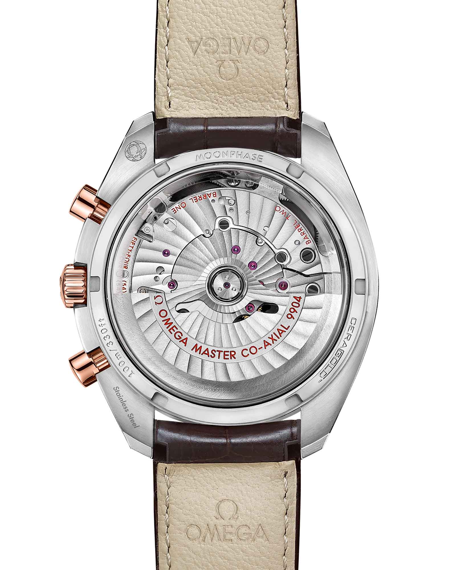 , создавая теплую гармонию оттенков. На "6 часах" расположен уникальный указатель фаз Луны - металлизированный хрустальный диск с детальным изображением лунной поверхности. Коричневый кожаный ремешок с раскладывающейся застежкой дополняет образ, а калибр OMEGA Co-Axial Master Chronometer 9904 с сертификатом METAS гарантирует точность, достойную космического наследия Speedmaster.