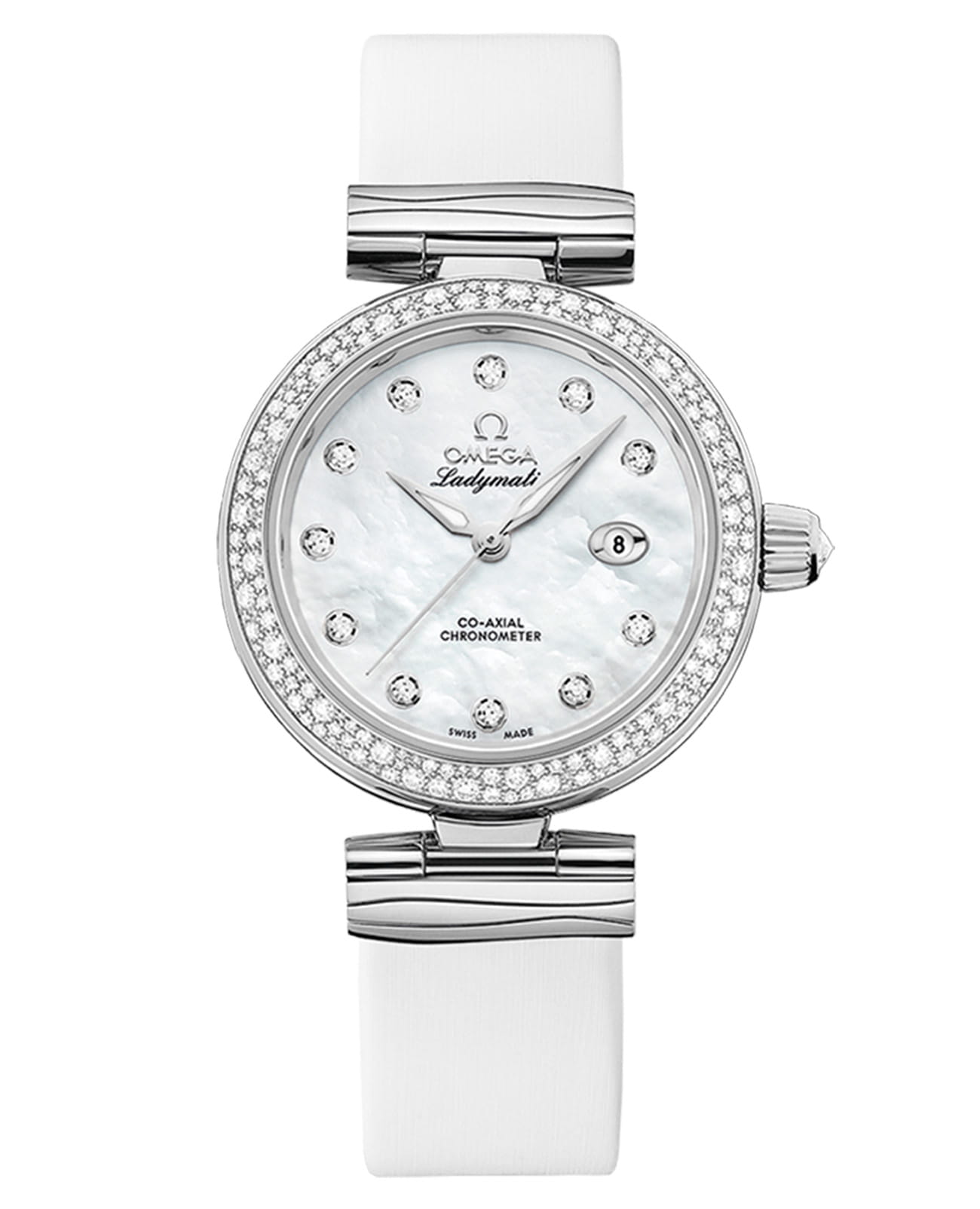 формы "альфа" и 11 бриллиантовых индексов переливаются на жемчужно-перламутровом циферблате, обрамленном безелемБезельВнешний ободок, закрепляющий стекло. В спортивных часах так называется поворотное кольцо с делениями на циферблате, выполняет роль таймера – замеряет отрезки времени на шкале. Неподвижный безель – элемент декора. Однонаправленно вращающийся безель на дайверских часах позволяет фиксировать моменты погружения и выныривания на поверхность. с россыпью бриллиантов разных размеров. Заводная головка с бриллиантом эксклюзивной огранки "Brilliant OMEGA Cut" добавляет ноту царственного блеска, а практичное окошко даты на "3 часах" гармонично вписывается в композицию. Внутри этой ювелирной гармонии бьется высокоточное сердце — коаксиальный механизм OMEGA калибра 8520, продолжающий традиции часового совершенства.
