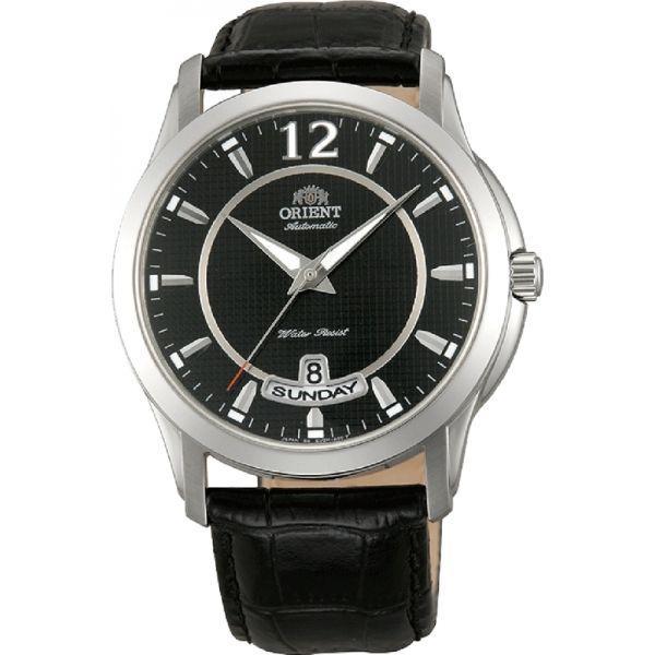 Минималистичный циферблат дополнен стильным узором. Модель оснащена японским автоматическим калибром Orient 46Е40 с запасом хода до 40 часов, противоударное устройство оси баланса обеспечивает лучшую защиту. Ремешок из натуральной кожи имеет рисунок под крокодиловую кожу. Стрелки и метки дополнены люминесцентной подсветкойЛюминесцентное покрытиеПозволяет считывать показания времени в темноте. Производители наносят на стрелки, часовые индексы, безель или поверхность циферблата светонакопительный состав, дающий холодное свечение.. Функции: отображение числа, дня недели.