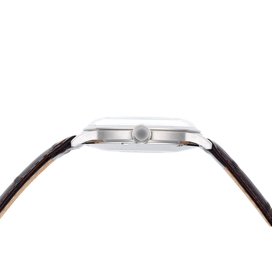 Ремешок выполнен из натуральной кожи с тиснением под крокодила и дополнен классической пряжкой. Его тёплый коричневый оттенок удачно сочетается с оттенком циферблата и добавляет образу завершённости. Водонепроницаемость — до 3 ATM, что подходит для защиты от случайных брызг и дождя.