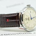 Циферблат сливочного оттенка с лёгким сатиновым блеском оформлен в классическом стиле: римские цифры, тонкие стрелки насыщенного синего цвета и небольшое окно даты у отметки «3 часа». Всё это подчёркивает сдержанную аристократичность модели.