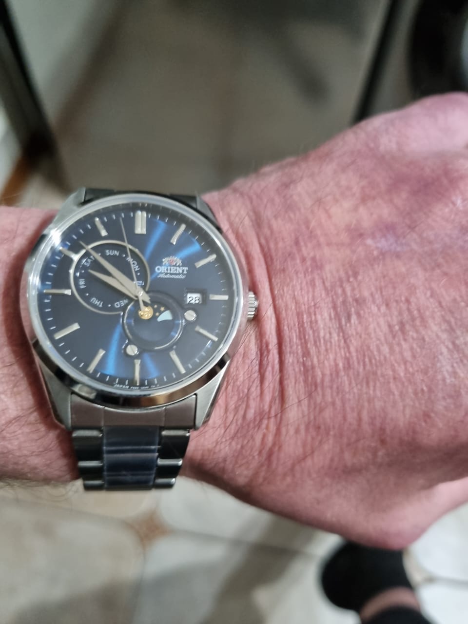 Часы Orient RA-AK0308L из коллекции Sun & Moon — это изысканная модель, сочетающая элегантный стиль и продвинутые функции. Корпус диаметром 42 мм выполнен из нержавеющей стали и защищён сапфировым стекломСапфировое стеклоПрочный и надёжный материал из кристалла сапфира синтетического происхождения, характеризующийся особой твёрдостью и устойчивостью к царапинам и повреждениям., обеспечивающим устойчивость к царапинам. Глубокий синий циферблат украшен серебристыми стрелками и , который элегантно отображает смену времени суток. Дополнительный индикатор дня недели и окошко даты на отметке «3 часа» придают модели функциональности и практичности. Автоматический механизм Orient Calibre F6B24 поддерживает ручной завод и функцию остановки секундной стрелки, обеспечивая точность и надёжность. Запас хода составляет до 40 часов. Браслет из нержавеющей стали с раскладной застёжкойРаскладная застёжкаТакой тип застёжки используется только на браслетах из металла. Она никогда не раскрывается полностью, происходит разделение на 2 и более частей. Раскладывающая застёжка снизит вероятность потери часов к минимуму. обеспечивает удобную посадку и надёжную фиксацию на запястье. Водонепроницаемость до 50 метров делает модель подходящей для повседневного использования. Orient RA-AK0308L — это идеальный выбор для ценителей японского качества, утончённого стиля и современных технологий.