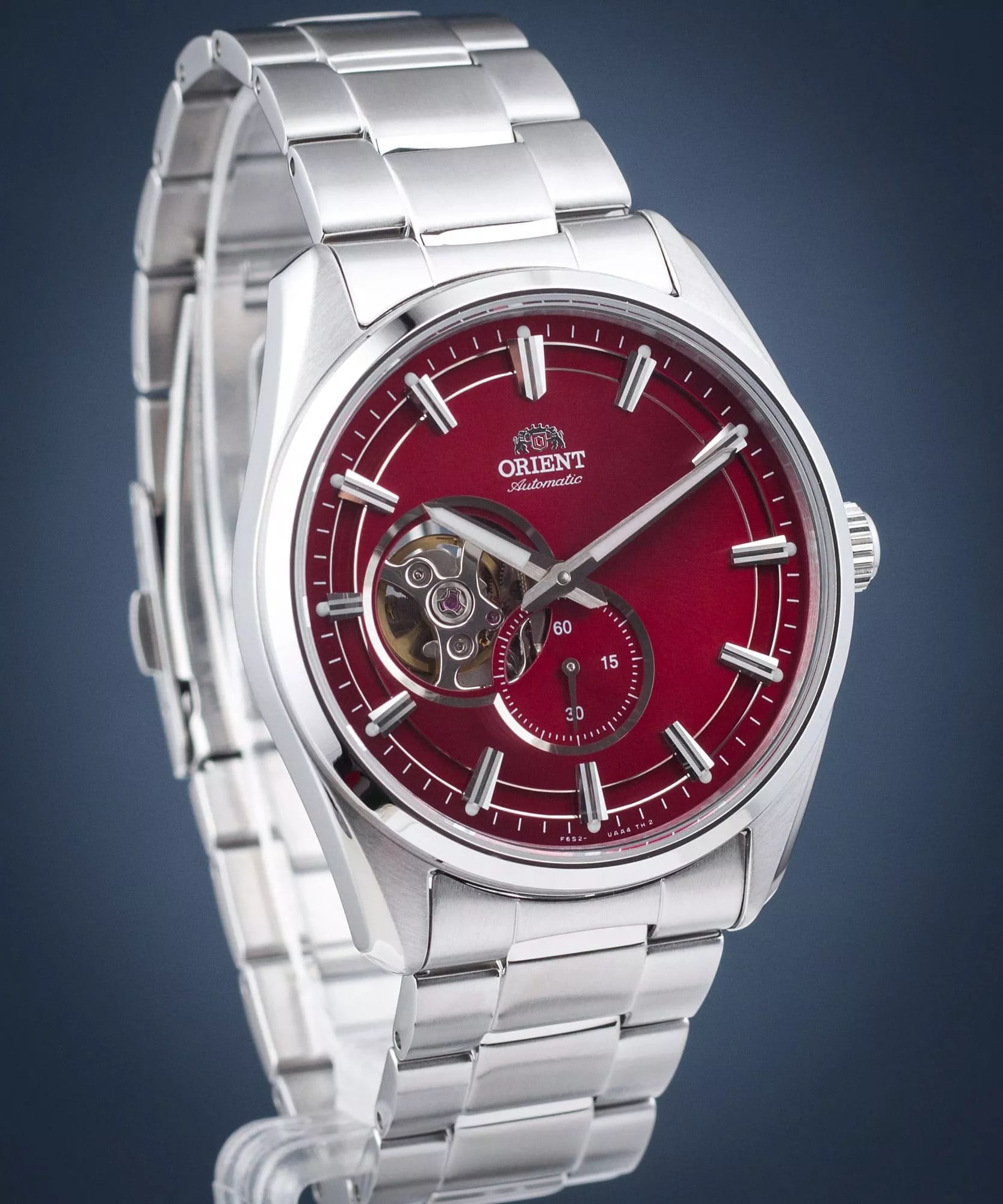 Часы Orient RN-AR0010R представляют собой модель из коллекции Contemporary, сочетающую в себе современный дизайн и функциональность. Это мужские механические часы с автоподзаводом, оснащённые калибром F6S22, который обеспечивает точность хода в пределах +25/-15 секунд в сутки и запас хода до 40 часов. Часы также поддерживают функцию ручного подзавода и остановки секундной стрелки (hacking stop), что позволяет точно синхронизировать время . Корпус часов выполнен из нержавеющей стали (SUS316L) и имеет диаметр 40,8 мм при толщине 10,9 мм. Водонепроницаемость модели составляет 50 метров, что защищает часы от случайных брызг или капель дождя, но не предназначено для плавания или дайвинга. Часы оснащены сапфировым стекломСапфировое стеклоПрочный и надёжный материал из кристалла сапфира синтетического происхождения, характеризующийся особой твёрдостью и устойчивостью к царапинам и повреждениям., устойчивым к царапинам, и винтовой задней крышкой с прозрачным окном, позволяющим наблюдать за работой механизма. Циферблат выполнен в красном цвете с полускелетонным дизайном, который открывает вид на механизм в области 9 часов. На циферблате расположены светящиеся метки и стрелки с люминесцентным покрытиемЛюминесцентное покрытиеПозволяет считывать показания времени в темноте. Производители наносят на стрелки, часовые индексы, безель или поверхность циферблата светонакопительный состав, дающий холодное свечение., обеспечивающие хорошую видимость в темноте. Также предусмотрено окно малой секундной стрелки на позиции 6 часов, что добавляет часам уникальный и стильный вид . Браслет часов изготовлен из нержавеющей стали и имеет ширину 22 мм. Застёжка выполнена в виде трёхзвенной складной конструкции с кнопочным замком, что обеспечивает надёжную фиксацию на запястье.