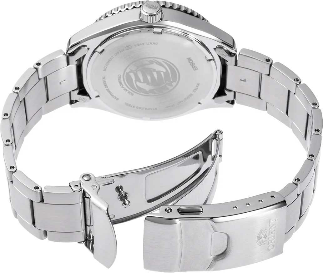 Мужские элегантные кварцевые часы Orient Mako Kamasu RA-WJ0002L1 выполнены в классическом спортивном стиле и оснащены солнечной батареей. Циферблат оформлен с использованием технологии Sunray (солнечные лучи), обеспечивая эффектный визуальный блеск. Метки в виде штрихов и арабских цифр. Эта изысканная модель имеет люминесцентное покрытиеЛюминесцентное покрытиеПозволяет считывать показания времени в темноте. Производители наносят на стрелки, часовые индексы, безель или поверхность циферблата светонакопительный состав, дающий холодное свечение. на стрелках и метках для отличной читаемости в темноте. Окошко даты расположено в положении 3 часов. Корпус изготовлен из стали. Часы оснащены вращающимся в одном направлении безелемБезельВнешний ободок, закрепляющий стекло. В спортивных часах так называется поворотное кольцо с делениями на циферблате, выполняет роль таймера – замеряет отрезки времени на шкале. Неподвижный безель – элемент декора. Однонаправленно вращающийся безель на дайверских часах позволяет фиксировать моменты погружения и выныривания на поверхность. с алюминиевой вставкой, который удобен при подсчёте времени. Защиту циферблата обеспечивает сапфировое стеклоСапфировое стеклоПрочный и надёжный материал из кристалла сапфира синтетического происхождения, характеризующийся особой твёрдостью и устойчивостью к царапинам и повреждениям., устойчивое к царапинам и повреждениям. Водозащита 200 WR позволяет использовать часы даже при активных водных занятиях. Часы установлены на стальной браслет с раскладной застёжкойРаскладная застёжкаТакой тип застёжки используется только на браслетах из металла. Она никогда не раскрывается полностью, происходит разделение на 2 и более частей. Раскладывающая застёжка снизит вероятность потери часов к минимуму., обеспечивающей надёжную фиксацию на руке. Это сочетание технологичности, прочности и эргономики для уверенных в себе людей.