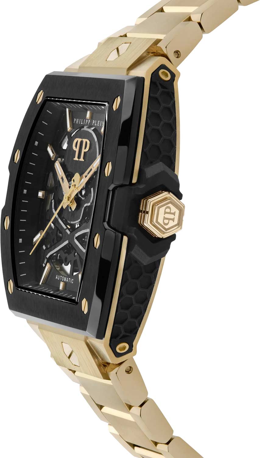 Philipp Plein The $keleton 2.0 PWJFA0625 - это дерзкие и бескомпромиссные часы, воплощающие бунтарский дух бренда. Их отличает узнаваемый мотив черепа, ставший визитной карточкой Philipp Plein, искусно интегрированный в дизайн циферблата. Скелетонизированные мужские механические часы с автоподзаводом. Бочкообразный стальной корпус диаметром 44 мм. Стальной браслет на застёжке «бабочка» с кнопкамиЗастёжка "бабочка"Такой вид застёжки дополняется предохранителями, помогающими избежать случайного раскрытия браслета. Обладают изящным исполнением. обеспечивает надёжную фиксацию и комфортное ношение. БезельБезельВнешний ободок, закрепляющий стекло. В спортивных часах так называется поворотное кольцо с делениями на циферблате, выполняет роль таймера – замеряет отрезки времени на шкале. Неподвижный безель – элемент декора. Однонаправленно вращающийся безель на дайверских часах позволяет фиксировать моменты погружения и выныривания на поверхность. с PVD-покрытиемPVDУльтратонкое покрытие наносится в технике вакуумного напыления, сочетает в себе нитрид титана особой прочности со слоем золота или оксида хрома. Несёт в себе декоративную или защитную функцию.. Метки в виде штрихов. Минеральное стеклоМинеральное стеклоМинеральное стекло представляет собой искусственно выращенный минерал кварца. Такое стекло отличается особой устойчивостью к повреждениям и царапинам. Уступает по некоторым качествам сапфировому стеклу. защищает циферблат от царапин. Люминесцентное покрытиеЛюминесцентное покрытиеПозволяет считывать показания времени в темноте. Производители наносят на стрелки, часовые индексы, безель или поверхность циферблата светонакопительный состав, дающий холодное свечение. стрелок и меток позволит следить за временем даже в полной темноте. Граненая заводная головка. Влагозащита: 50 метров, позволит защитить корпус от случайных брызг или капель дождя. Идеальный аксессуар для тех, кто ценит индивидуальность и не боится выделяться из толпы.