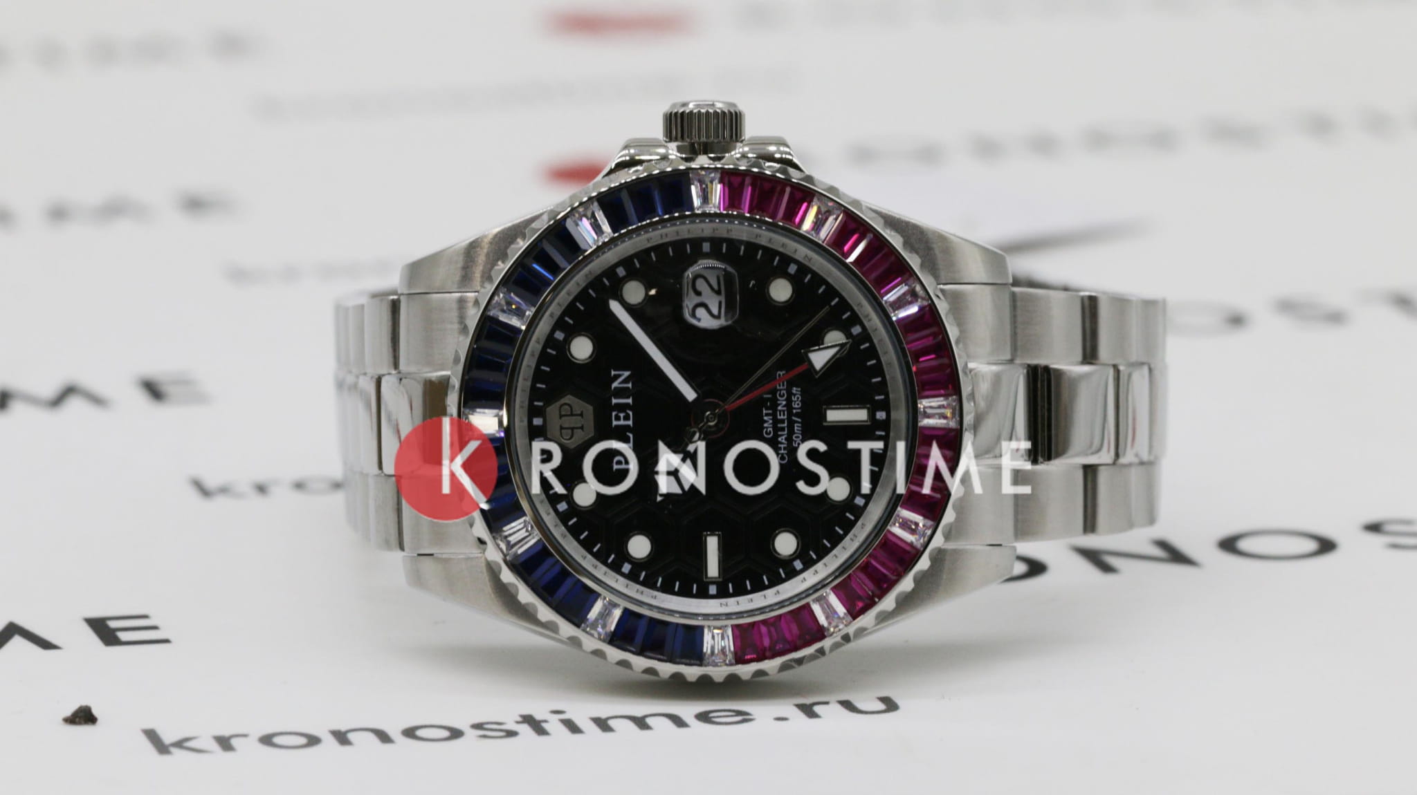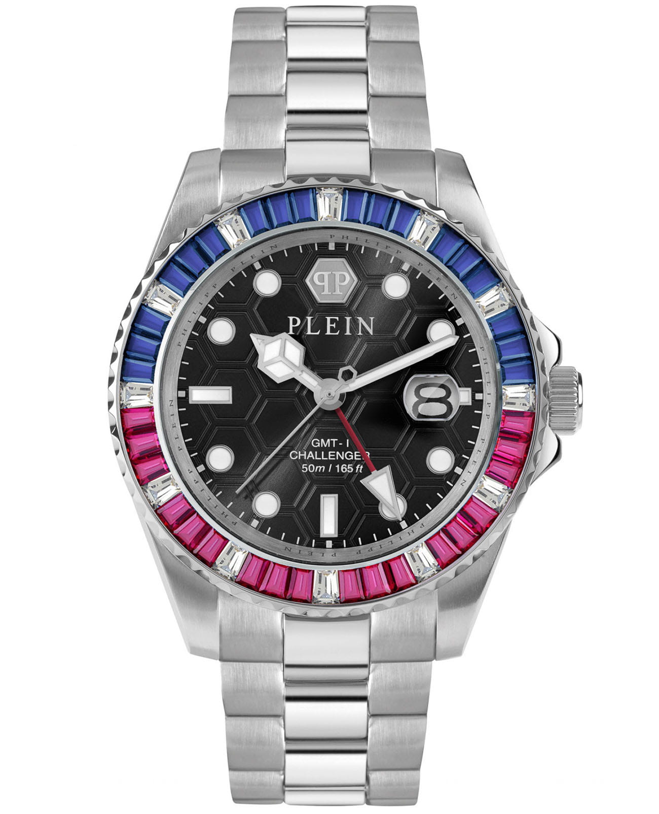 Часы Philipp Plein GMT-I Challenger Baguettes (модель PWPZA0124) — это стильный мужской аксессуар, который сочетает элегантный дизайн и высокое качество. Корпус диаметром 44 мм выполнен из нержавеющей стали и украшен 48 кристаллами огранки "багет" на безеле, что придаёт часам роскошный и выразительный вид. Чёрный циферблат с гильошированным узором и фирменными гексаграммами Philipp Plein создаёт узнаваемый стиль. Циферблат защищён минеральным стекломМинеральное стеклоМинеральное стекло представляет собой искусственно выращенный минерал кварца. Такое стекло отличается особой устойчивостью к повреждениям и царапинам. Уступает по некоторым качествам сапфировому стеклу., устойчивым к царапинам.БезельБезельВнешний ободок, закрепляющий стекло. В спортивных часах так называется поворотное кольцо с делениями на циферблате, выполняет роль таймера – замеряет отрезки времени на шкале. Неподвижный безель – элемент декора. Однонаправленно вращающийся безель на дайверских часах позволяет фиксировать моменты погружения и выныривания на поверхность. с PVD-покрытиемPVDУльтратонкое покрытие наносится в технике вакуумного напыления, сочетает в себе нитрид титана особой прочности со слоем золота или оксида хрома. Несёт в себе декоративную или защитную функцию..