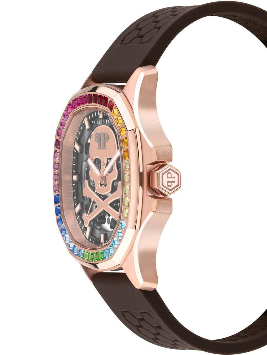 Яркие мужские часы с минеральным стекломМинеральное стеклоМинеральное стекло представляет собой искусственно выращенный минерал кварца. Такое стекло отличается особой устойчивостью к повреждениям и царапинам. Уступает по некоторым качествам сапфировому стеклу. Philipp Plein PWRAA0623, механический механизм. Класс водозащиты: 50 метров, позволит защитить корпус от случайных брызг или капель дождя. Корпус часов изготовлен из стали и украшен кристаллами. Стрелки и метки с люминесцентным покрытиемЛюминесцентное покрытиеПозволяет считывать показания времени в темноте. Производители наносят на стрелки, часовые индексы, безель или поверхность циферблата светонакопительный состав, дающий холодное свечение.. Скелетонизированные. Часы с механизмом, из которого удалён весь «лишний» металл, с прозрачными циферблатом и задней крышкой,