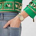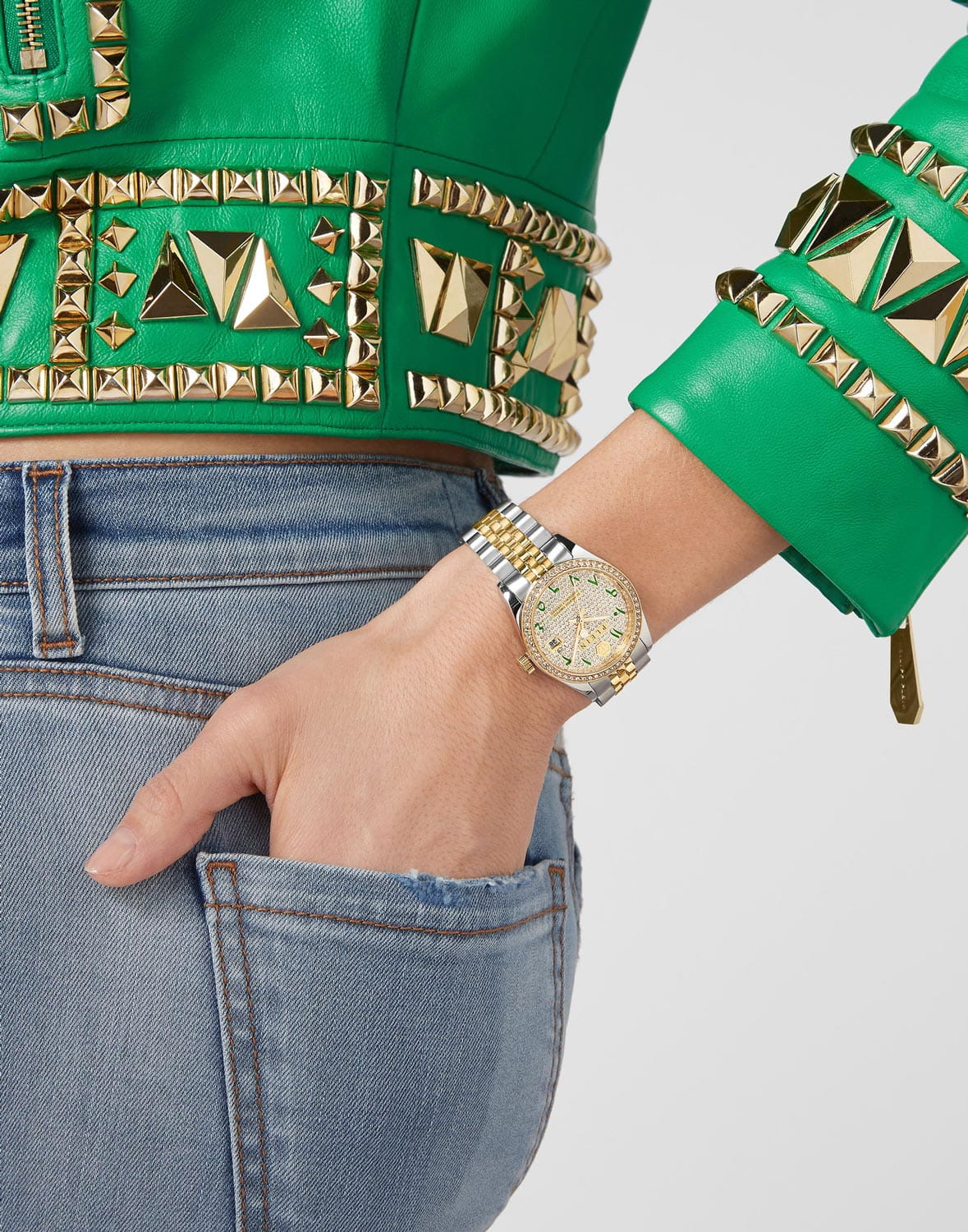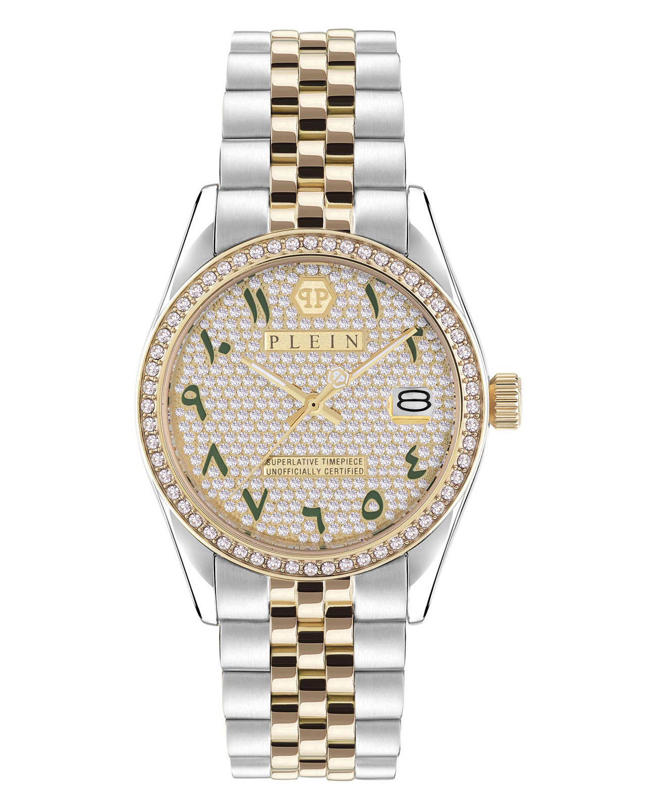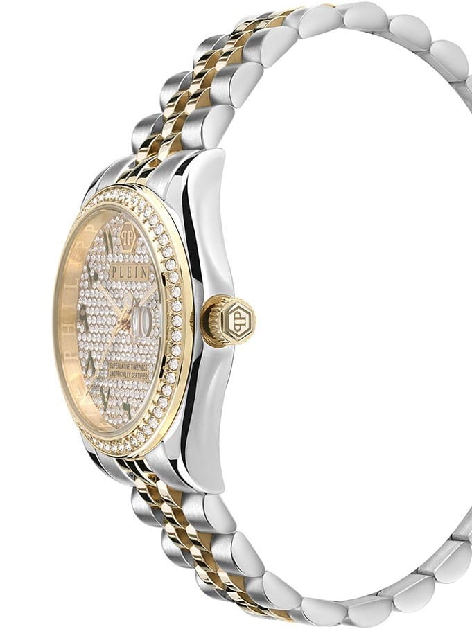 Яркие женские часы Philipp Plein Date Superlative PWYAA0823 c с минеральным стекломМинеральное стеклоМинеральное стекло представляет собой искусственно выращенный минерал кварца. Такое стекло отличается особой устойчивостью к повреждениям и царапинам. Уступает по некоторым качествам сапфировому стеклу.. Особенные часы для особенных женщин! Ослепительный аксессуар, демонстрирующий роскошь и изысканность.Часы с круглым стальным корпусом с IP-покрытиемIP-покрытиеМетод ионного напыления. Демонстрирует повышенную устойчивость к истиранию, окислению и химическим веществам. Под воздействием высокого давления и температуры около 1500°C молекулы металла надёжно соединяются с частицами корпуса часов.. Перламутровый циферблат с метками в виде точек, украшенных кристаллами. Люминесцентное покрытиеЛюминесцентное покрытиеПозволяет считывать показания времени в темноте. Производители наносят на стрелки, часовые индексы, безель или поверхность циферблата светонакопительный состав, дающий холодное свечение. стрелок. Окошко даты с увеличительным стеклом находится в положении 3 часа. Рифленая заводная головка. Стальной браслет на застёжке бабочка с кнопкамиЗастёжка "бабочка"Такой вид застёжки дополняется предохранителями, помогающими избежать случайного раскрытия браслета. Обладают изящным исполнением.