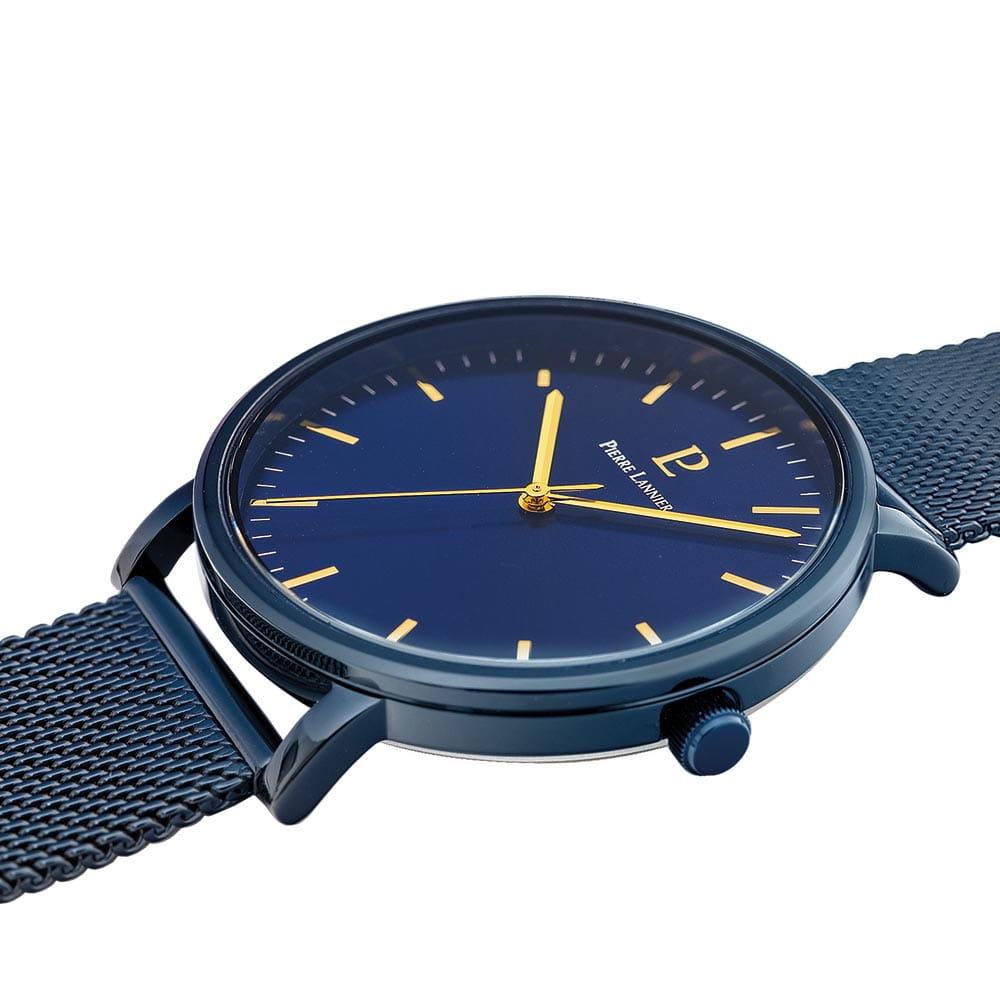 Мужские кварцевые часы Pierre Lannier Echo 388C466. Синий циферблат. Центральные часовая,минутная и секундная стрелки. Круглый корпус выполнен из полированной нержавеющей стали. Синий стальной браслет выполнен в технике миланского плетения, на раскладной застёжкеРаскладная застёжкаТакой тип застёжки используется только на браслетах из металла. Она никогда не раскрывается полностью, происходит разделение на 2 и более частей. Раскладывающая застёжка снизит вероятность потери часов к минимуму.. Минеральное стеклоМинеральное стеклоМинеральное стекло представляет собой искусственно выращенный минерал кварца. Такое стекло отличается особой устойчивостью к повреждениям и царапинам. Уступает по некоторым качествам сапфировому стеклу., устойчивое к мелким механическим повреждениям. Диаметр корпуса составляет 40,5 мм, толщина 7,9 мм. Водостойкость:50 метров, позволит защитить корпус от случайных брызг или капель дождя. Синий кожаный ремешок в комплекте.