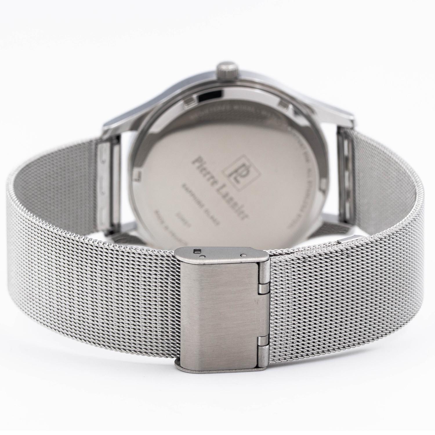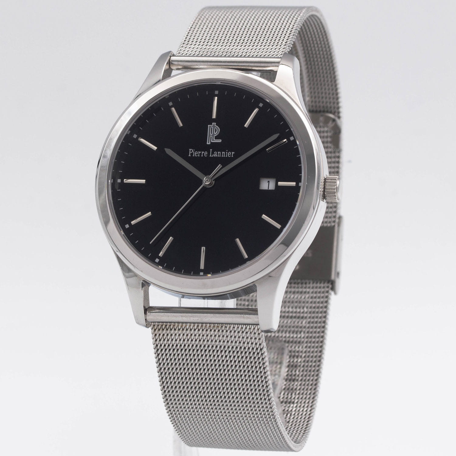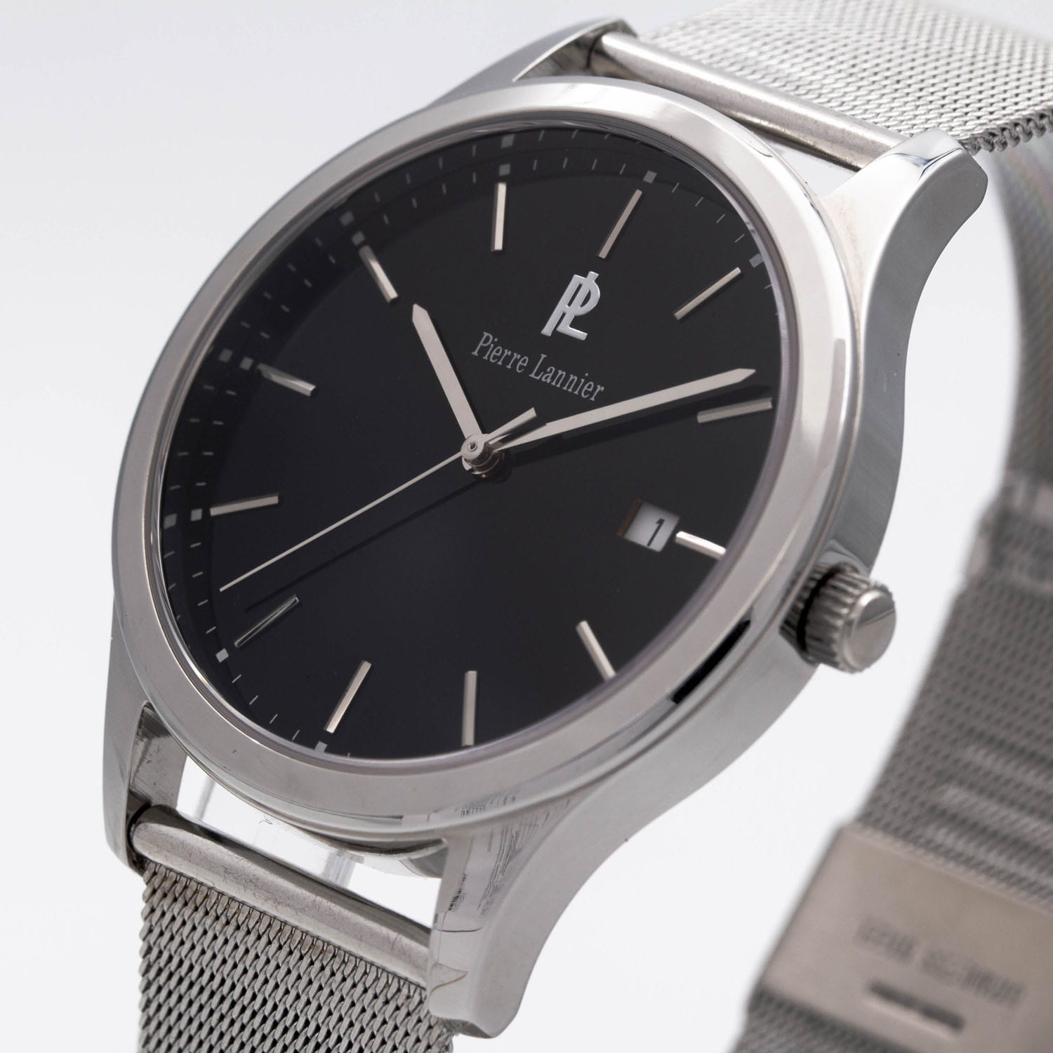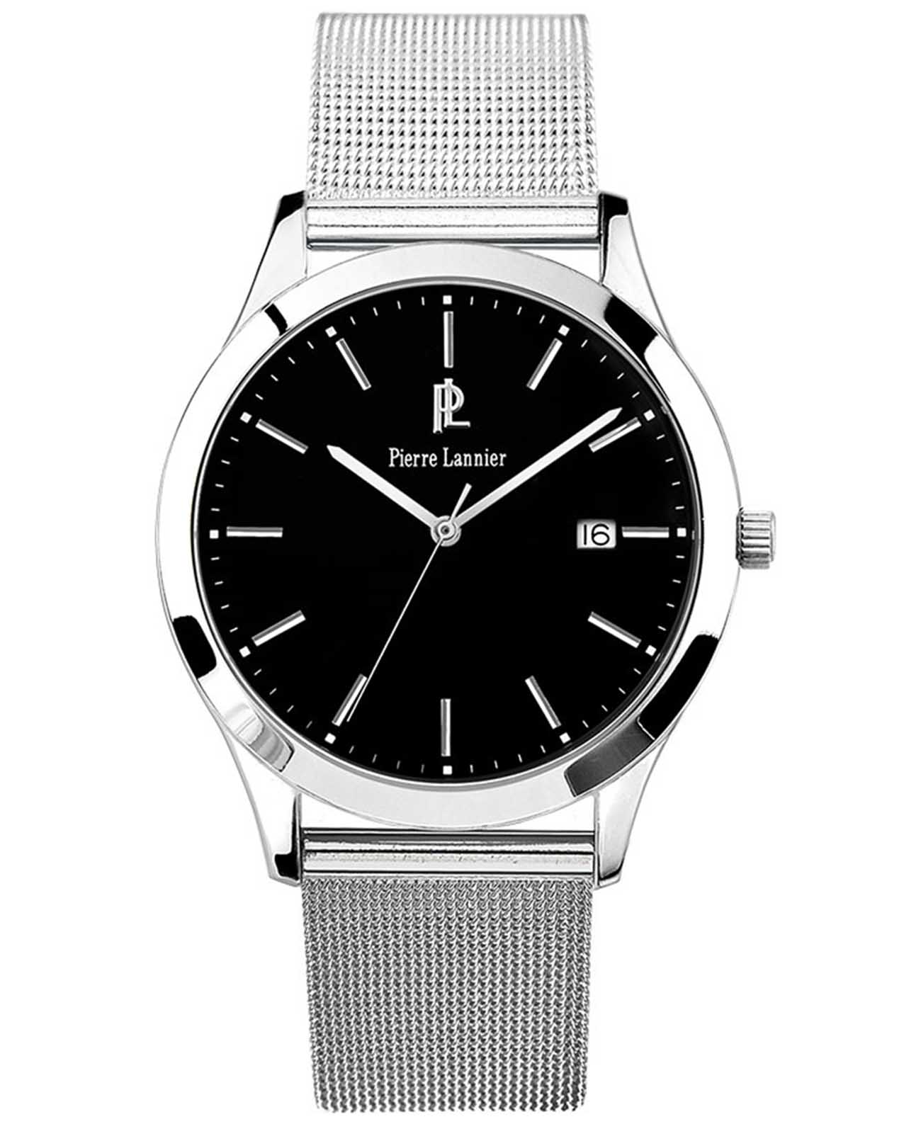 Мужские кварцевые часы Pierre Lannier Elegance Style 228G138. Минеральное стеклоМинеральное стеклоМинеральное стекло представляет собой искусственно выращенный минерал кварца. Такое стекло отличается особой устойчивостью к повреждениям и царапинам. Уступает по некоторым качествам сапфировому стеклу. устойчивое к мелким механическим повреждениям. Корпус выполнен из нержавеющей стали. Центральная секундная стрелка. Индикация даты в позиции трех часов. Стальной браслет миланского плетения, раскладная застёжкаРаскладная застёжкаТакой тип застёжки используется только на браслетах из металла. Она никогда не раскрывается полностью, происходит разделение на 2 и более частей. Раскладывающая застёжка снизит вероятность потери часов к минимуму.. Водостойкость WR 50 (мытье рук, дождь).