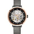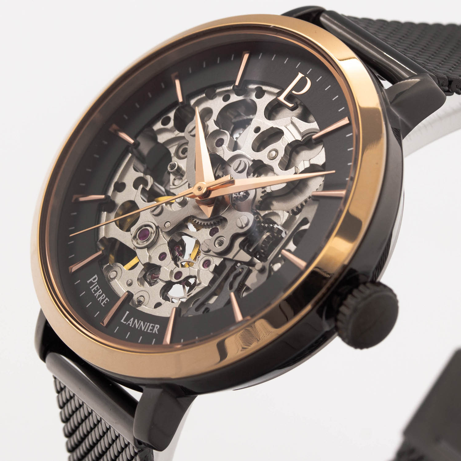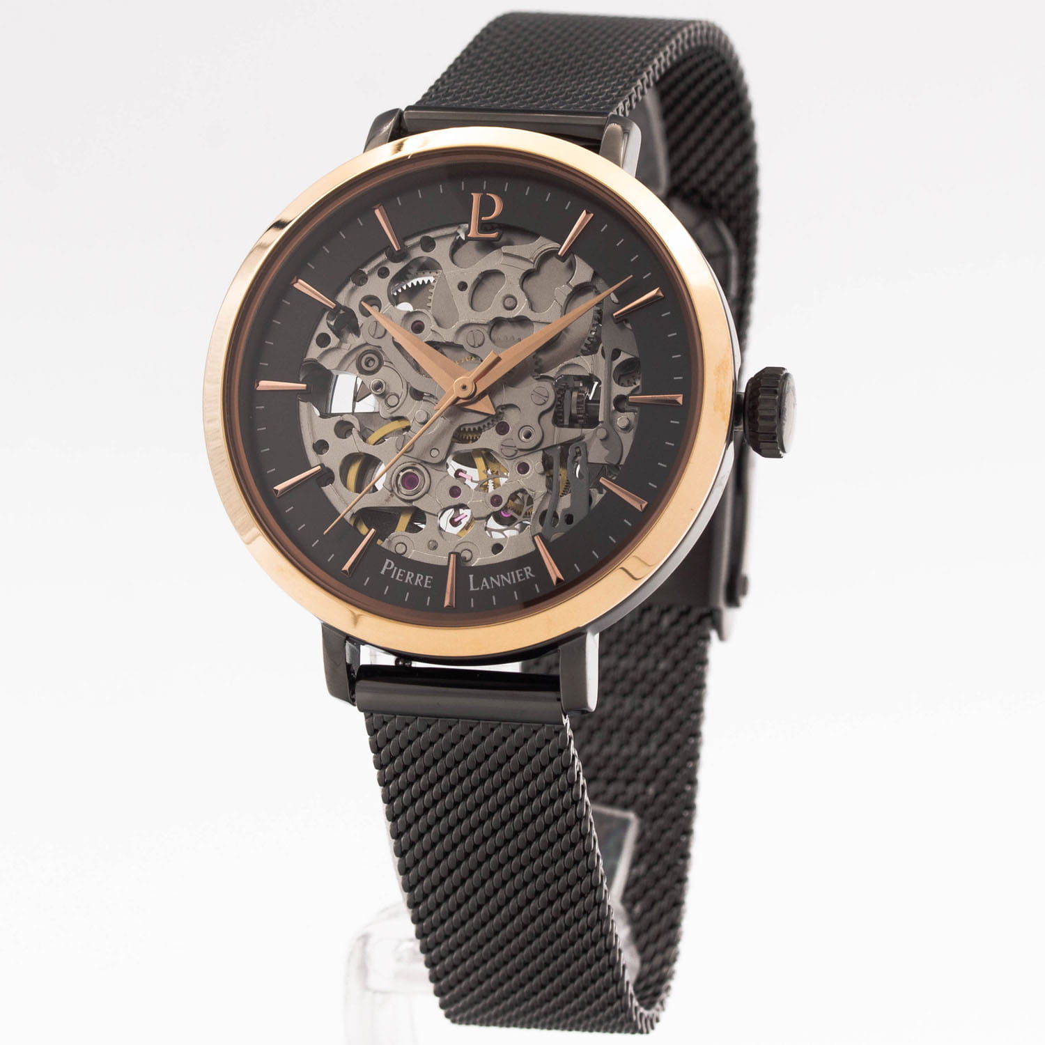 Женские механические часы с автоподзаводом Pierre Lannier Automatic 314C988 . Минеральное стеклоМинеральное стеклоМинеральное стекло представляет собой искусственно выращенный минерал кварца. Такое стекло отличается особой устойчивостью к повреждениям и царапинам. Уступает по некоторым качествам сапфировому стеклу. устойчивое к мелким механическим повреждениям. Скелетонизированный циферблат. Центральные часовая, минутная и секундная стрелки. Корпус и браслет выполнен из нержавеющей стали с IP-покрытиемIP-покрытиеМетод ионного напыления. Демонстрирует повышенную устойчивость к истиранию, окислению и химическим веществам. Под воздействием высокого давления и температуры около 1500°C молекулы металла надёжно соединяются с частицами корпуса часов.. Неподвижный безельБезельВнешний ободок, закрепляющий стекло. В спортивных часах так называется поворотное кольцо с делениями на циферблате, выполняет роль таймера – замеряет отрезки времени на шкале. Неподвижный безель – элемент декора. Однонаправленно вращающийся безель на дайверских часах позволяет фиксировать моменты погружения и выныривания на поверхность. из нержавеющей стали с IP-покрытиемIP-покрытиеМетод ионного напыления. Демонстрирует повышенную устойчивость к истиранию, окислению и химическим веществам. Под воздействием высокого давления и температуры около 1500°C молекулы металла надёжно соединяются с частицами корпуса часов. цвета розового золота. Водостойкость: 30 метров, позволит защитить корпус от случайных брызг или капель дождя. Стальной браслет миланского плетения с раскладной застёжкойРаскладная застёжкаТакой тип застёжки используется только на браслетах из металла. Она никогда не раскрывается полностью, происходит разделение на 2 и более частей. Раскладывающая застёжка снизит вероятность потери часов к минимуму..
