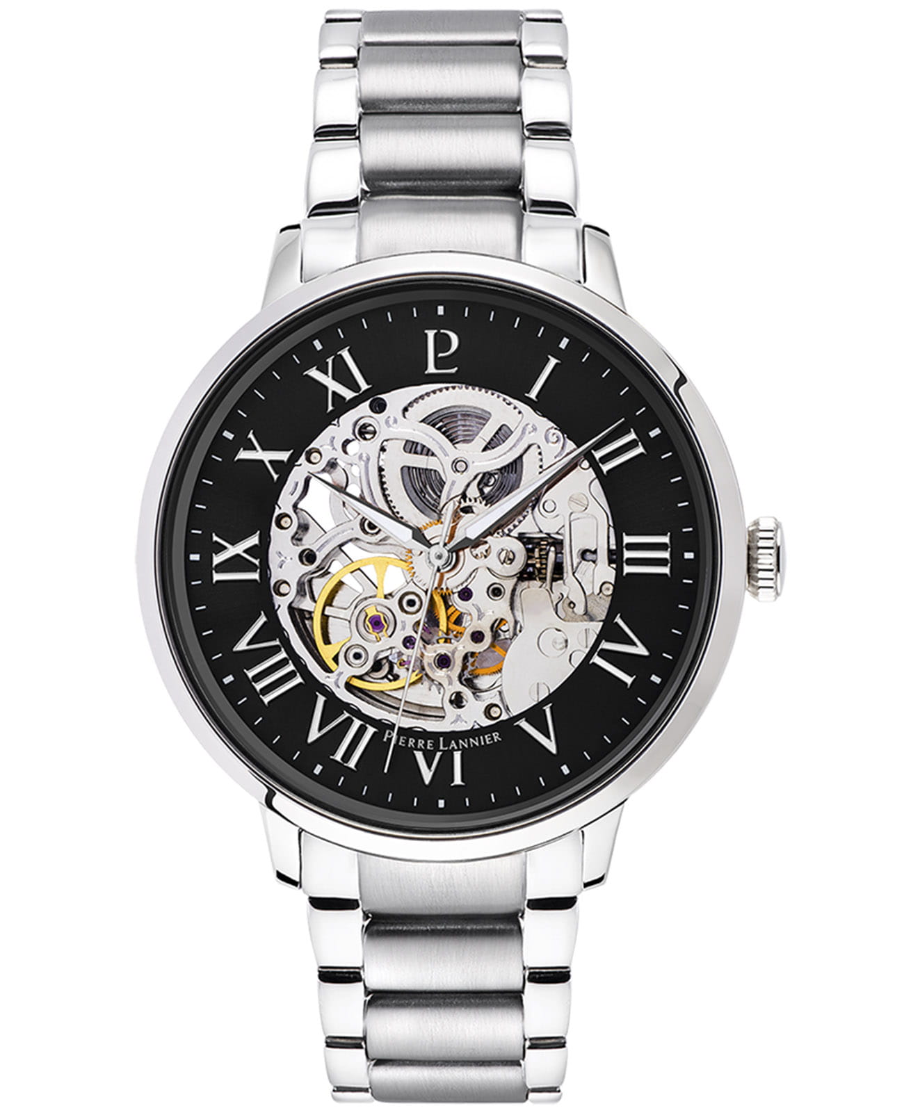 Мужские механические часы с автоподзаводом Pierre Lannier Automatic 317B131. Минеральное стеклоМинеральное стеклоМинеральное стекло представляет собой искусственно выращенный минерал кварца. Такое стекло отличается особой устойчивостью к повреждениям и царапинам. Уступает по некоторым качествам сапфировому стеклу. устойчивое к мелким механическим повреждениям. Центральные часовая, минутная и секундная стрелки. Корпус и браслет выполнены из нержавеющей стали. Водостойкость: 50 метров, позволит защитить корпус от случайных брызг или капель дождя. Стрелки с люминесцентным покрытиемЛюминесцентное покрытиеПозволяет считывать показания времени в темноте. Производители наносят на стрелки, часовые индексы, безель или поверхность циферблата светонакопительный состав, дающий холодное свечение.. Черный скелетонизированный циферблат. Браслет на раскладной застёжкеРаскладная застёжкаТакой тип застёжки используется только на браслетах из металла. Она никогда не раскрывается полностью, происходит разделение на 2 и более частей. Раскладывающая застёжка снизит вероятность потери часов к минимуму.. Прозрачная задняя крышка.