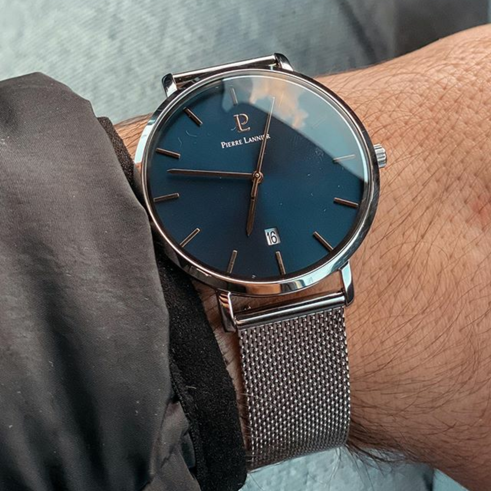 Мужские кварцевые часы Pierre Lannier Echo 370H168. Центральные часовая, минутная и секундная стрелки. Синий циферблат с часовыми индексами в виде штрихов. Окошко даты в позиции 6 часов. Круглый корпус выполнен из полированной нержавеющей стали. Стальной браслет выполнен в технике миланского плетения, раскладная застёжкаРаскладная застёжкаТакой тип застёжки используется только на браслетах из металла. Она никогда не раскрывается полностью, происходит разделение на 2 и более частей. Раскладывающая застёжка снизит вероятность потери часов к минимуму.. Прочное минеральное стеклоМинеральное стеклоМинеральное стекло представляет собой искусственно выращенный минерал кварца. Такое стекло отличается особой устойчивостью к повреждениям и царапинам. Уступает по некоторым качествам сапфировому стеклу., устойчивое к мелким механическим повреждениям. Водостойкость: 30 метров, позволит защитить корпус от случайных брызг или капель дождя.
