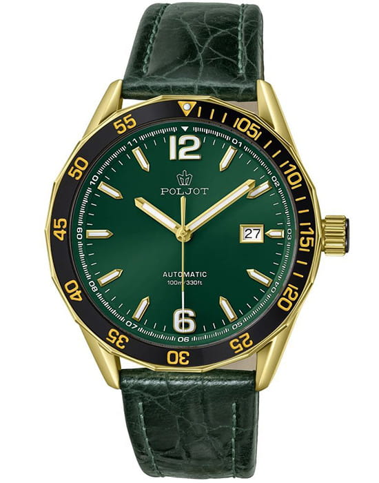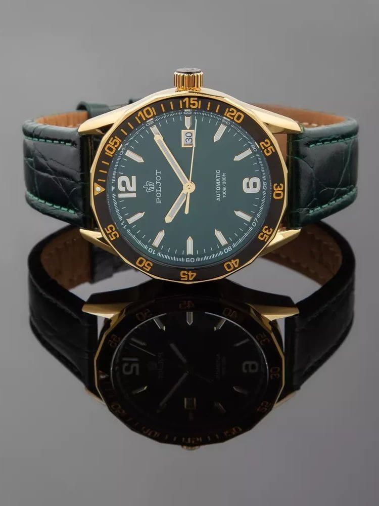Poljot NH35A.186264 — надёжные механические мужские часы с автоподзаводом, сочетающие техническую точность и выразительный спортивный стиль. Корпус из нержавеющей стали  с PVD-покрытиемPVDУльтратонкое покрытие наносится в технике вакуумного напыления, сочетает в себе нитрид титана особой прочности со слоем золота или оксида хрома. Несёт в себе декоративную или защитную функцию. подчёркивает прочность конструкции, а насыщенный циферблат с акцентами на стрелках и метках придаёт модели динамичный и современный облик. БезельБезельВнешний ободок, закрепляющий стекло. В спортивных часах так называется поворотное кольцо с делениями на циферблате, выполняет роль таймера – замеряет отрезки времени на шкале. Неподвижный безель – элемент декора. Однонаправленно вращающийся безель на дайверских часах позволяет фиксировать моменты погружения и выныривания на поверхность. с PVD-покрытиемPVDУльтратонкое покрытие наносится в технике вакуумного напыления, сочетает в себе нитрид титана особой прочности со слоем золота или оксида хрома. Несёт в себе декоративную или защитную функцию.. Внутри установлен проверенный японский механизм SEIKO NH35, обеспечивающий стабильную работу и плавный ход секундной стрелки. Окно даты добавляет функциональности, а широкие метки с люминесцентным покрытиемЛюминесцентное покрытиеПозволяет считывать показания времени в темноте. Производители наносят на стрелки, часовые индексы, безель или поверхность циферблата светонакопительный состав, дающий холодное свечение. обеспечивают отличную читаемость даже в темноте. Прочное минеральное стеклоМинеральное стеклоМинеральное стекло представляет собой искусственно выращенный минерал кварца. Такое стекло отличается особой устойчивостью к повреждениям и царапинам. Уступает по некоторым качествам сапфировому стеклу. защищает циферблат от царапин, а ремешок из натуральной кожи с контрастной прострочкой гарантирует комфорт и надёжную посадку. Poljot — часы с характером, созданные для тех, кто ценит точность, качество и спортивную уверенность в каждой детали.