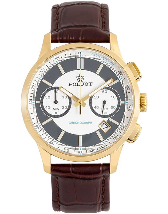 Poljot 6S21.906217 — современные мужские часы с выразительным спортивным дизайном и надёжной функциональностью. Корпус из нержавеющей стали с с PVD-покрытиемPVDУльтратонкое покрытие наносится в технике вакуумного напыления, сочетает в себе нитрид титана особой прочности со слоем золота или оксида хрома. Несёт в себе декоративную или защитную функцию. подчёркивает прочность и уверенный характер модели, а глубокий циферблат с счётчиками хронографаХронографФункция позволяет измерять отрезки времени с особой точностью: часы, минуты, секунды. Верным признаком хронографа является наличие на циферблате 3 дополнительных окошек-счётчиков. и аккуратным окном даты придаёт часам динамичный вид. Контрастные стрелки и метки с люминесцентным покрытиемЛюминесцентное покрытиеПозволяет считывать показания времени в темноте. Производители наносят на стрелки, часовые индексы, безель или поверхность циферблата светонакопительный состав, дающий холодное свечение. обеспечивают удобство считывания информации в любое время суток, а внешняя шкала тахиметраТахиметрРазмеченная шкала, располагается на ободке или безеле часов. Тахиметр позволяет рассчитать скорость на определённом участке пути, расстояние измеряется в километрах или милях. добавляет спортивную функциональность. Прочное минеральное стеклоМинеральное стеклоМинеральное стекло представляет собой искусственно выращенный минерал кварца. Такое стекло отличается особой устойчивостью к повреждениям и царапинам. Уступает по некоторым качествам сапфировому стеклу. защищает циферблат от царапин, а ремешок из натуральной кожи гарантирует комфорт и элегантную посадку на запястье. Poljot — это гармония классики и спортивного духа, созданная для мужчин, ценящих точность, надёжность и уверенный стиль.