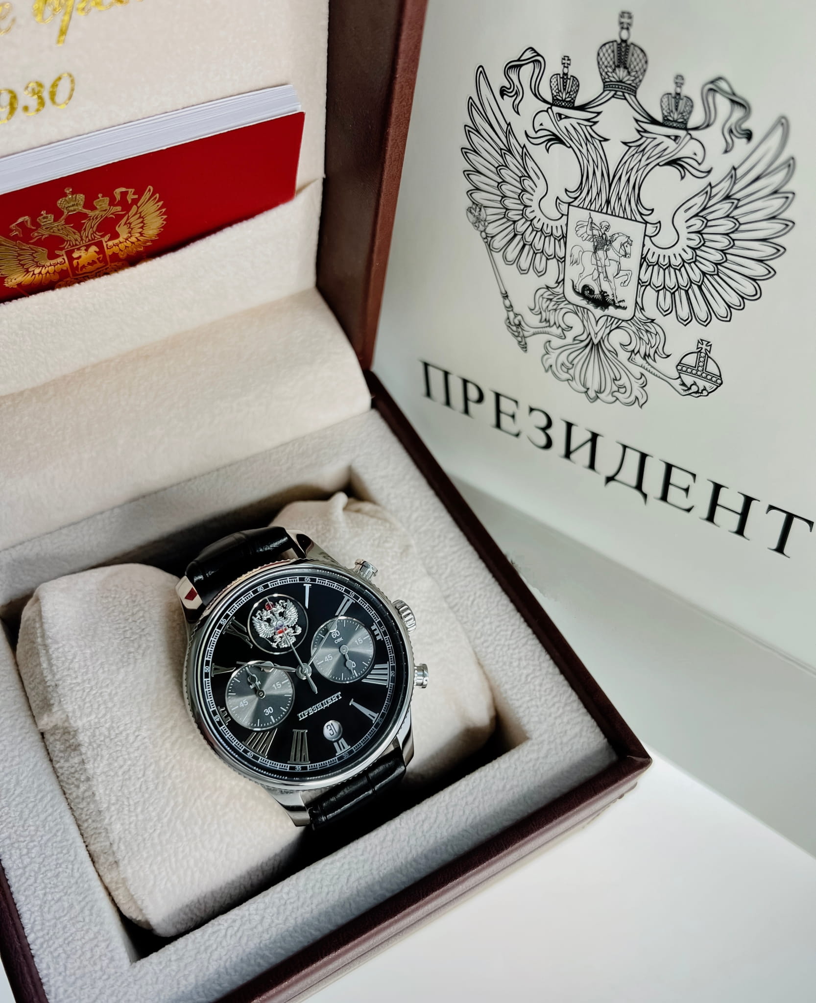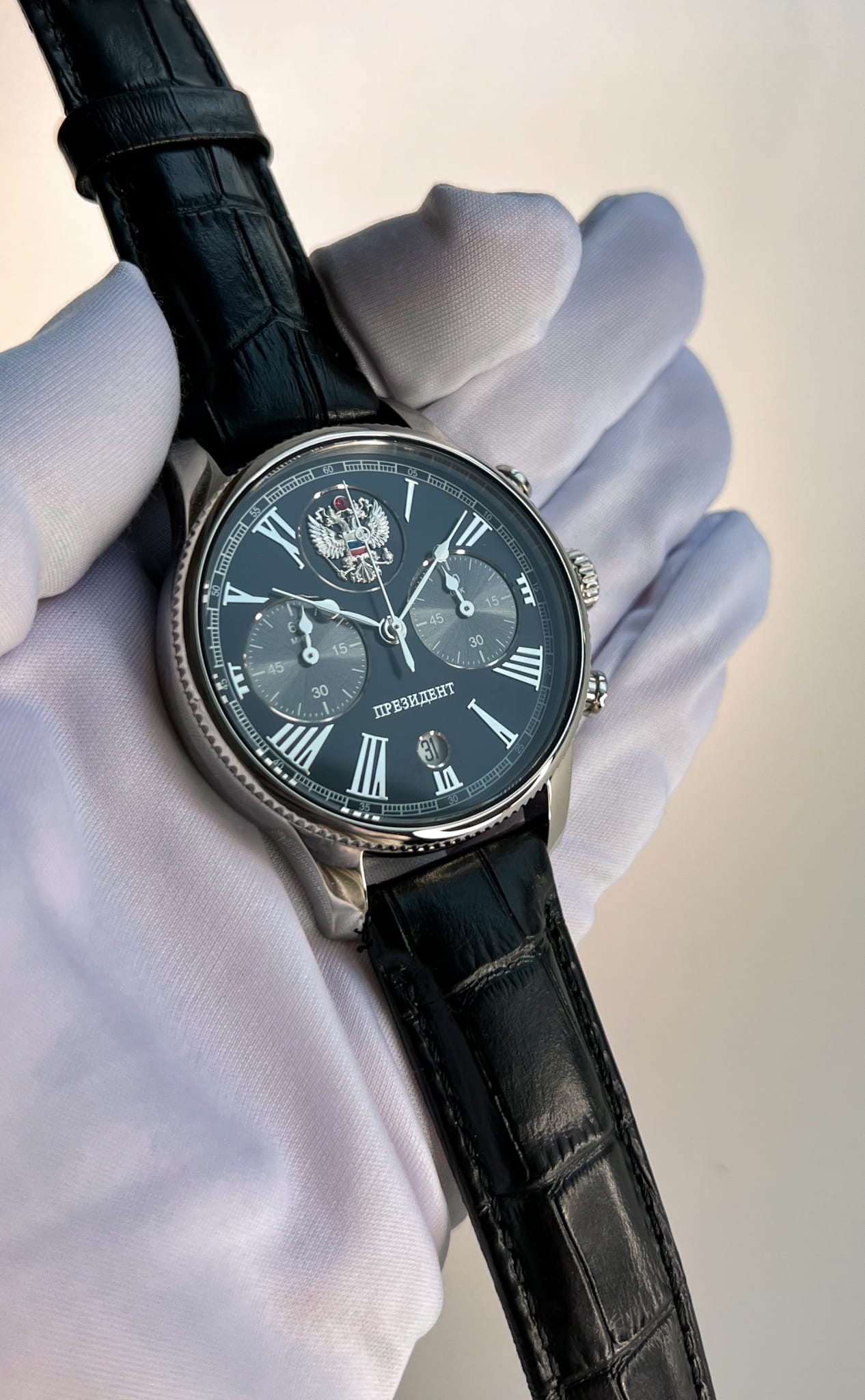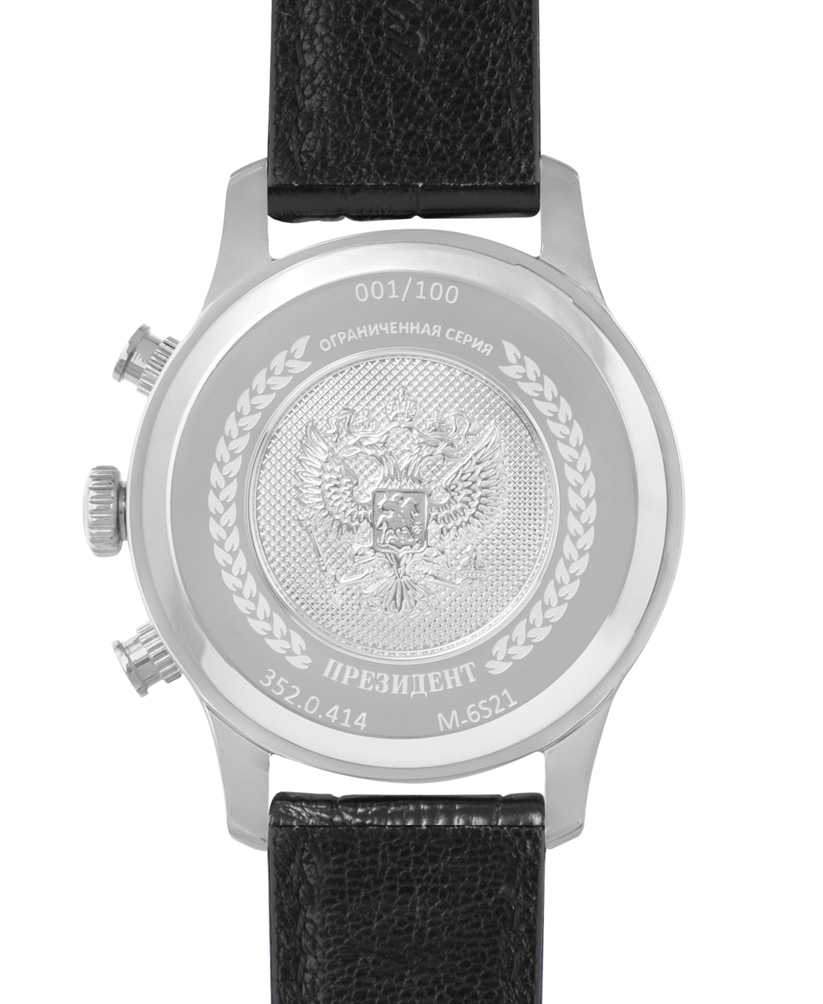 Часы «Президент» модели 3520414 — это мужские кварцевые наручные часы с хронографом, сочетающие классический дизайн и функциональность. Механизм: кварцевый хронограф Miyota 6S21, обеспечивающий точность и надёжность. Функции: часы, минуты, секунды, дата, хронограф (секундомер). Корпус: из нержавеющей стали, диаметр 41,8 мм, толщина 11,4 мм. Циферблат: чёрный с римскими цифрами и государственным гербом, подчёркивающий элегантность дизайна. Стекло: сапфировое стеклоСапфировое стеклоПрочный и надёжный материал из кристалла сапфира синтетического происхождения, характеризующийся особой твёрдостью и устойчивостью к царапинам и повреждениям. с антибликовым покрытием, устойчивое к царапинам. Водонепроницаемость: 5 ATM (50 метров), подходящая для повседневного использования. Ремешок: кожаный, шириной 20 мм, с классической застёжкой. Эти часы — отличный выбор для деловых людей, ценящих сочетание стиля и функциональности.