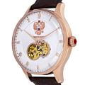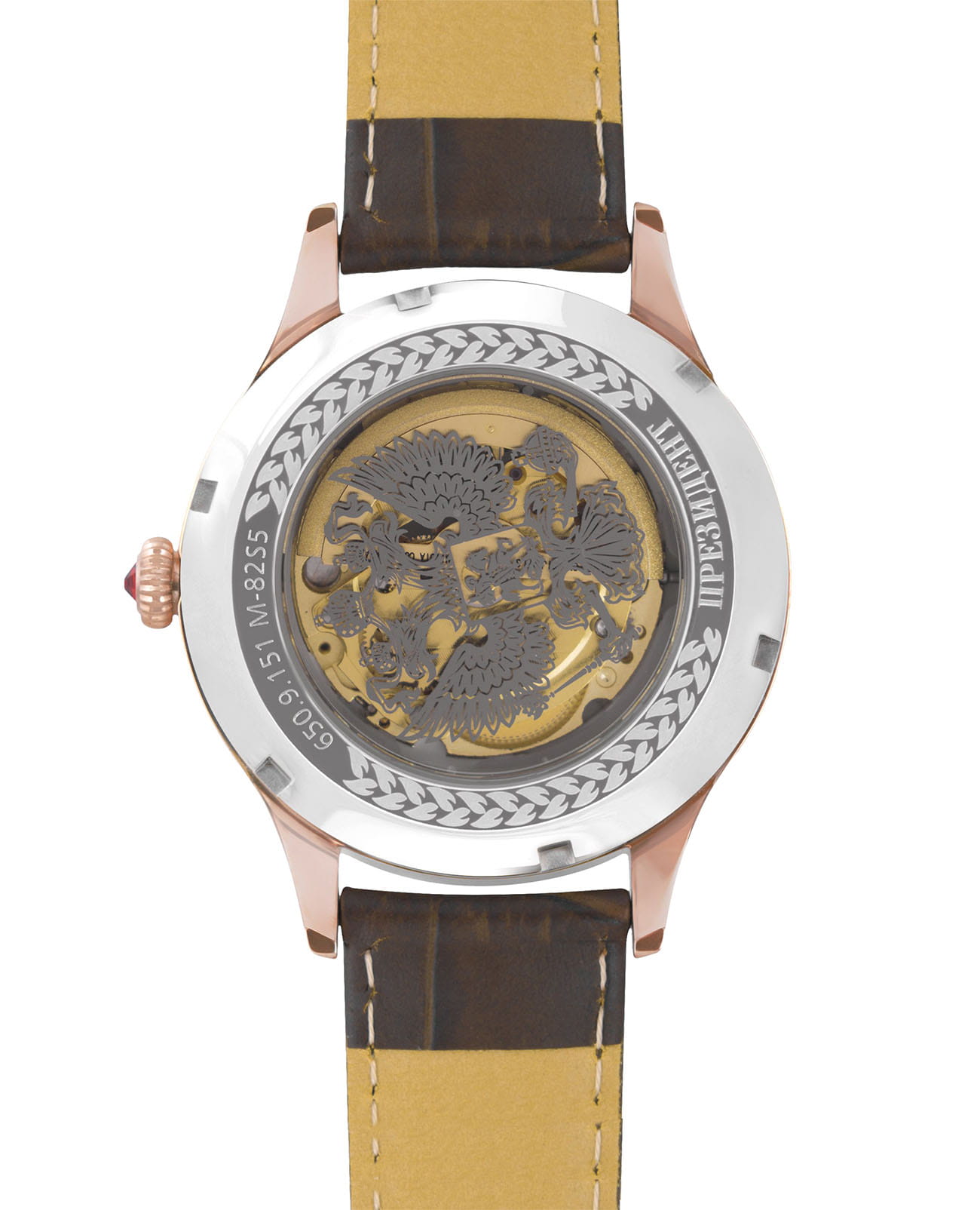Мужские часы из коллекции «Президент» — это классический аксессуар, сочетающий в себе элегантность и надёжность. Модель выполнена в круглой форме с корпусом диаметром 42,5 мм и толщиной 16,3 мм, защищённым минеральным стекломМинеральное стеклоМинеральное стекло представляет собой искусственно выращенный минерал кварца. Такое стекло отличается особой устойчивостью к повреждениям и царапинам. Уступает по некоторым качествам сапфировому стеклу., устойчивым к мелким повреждениям. Браслет коричневого цвета изготовлен из натуральной кожи и дополнен стандартной застёжкой, что делает его удобным и практичным для повседневного использования. Часы оснащены механизмом с автоподзаводом, обеспечивающим точность хода и минимальное обслуживание. Прозрачная задняя крышка украшена изображением Герба России, что подчёркивает национальную принадлежность и уникальность модели. Водонепроницаемость позволяет использовать модель в повседневных условиях — при мытье рук или под лёгким дождём. Эти часы станут универсальным аксессуаром для тех, кто ценит сочетание стиля, качества и символики — идеальный выбор для уверенных в себе мужчин, следящих за своим имиджем и предпочитающих выделяться.