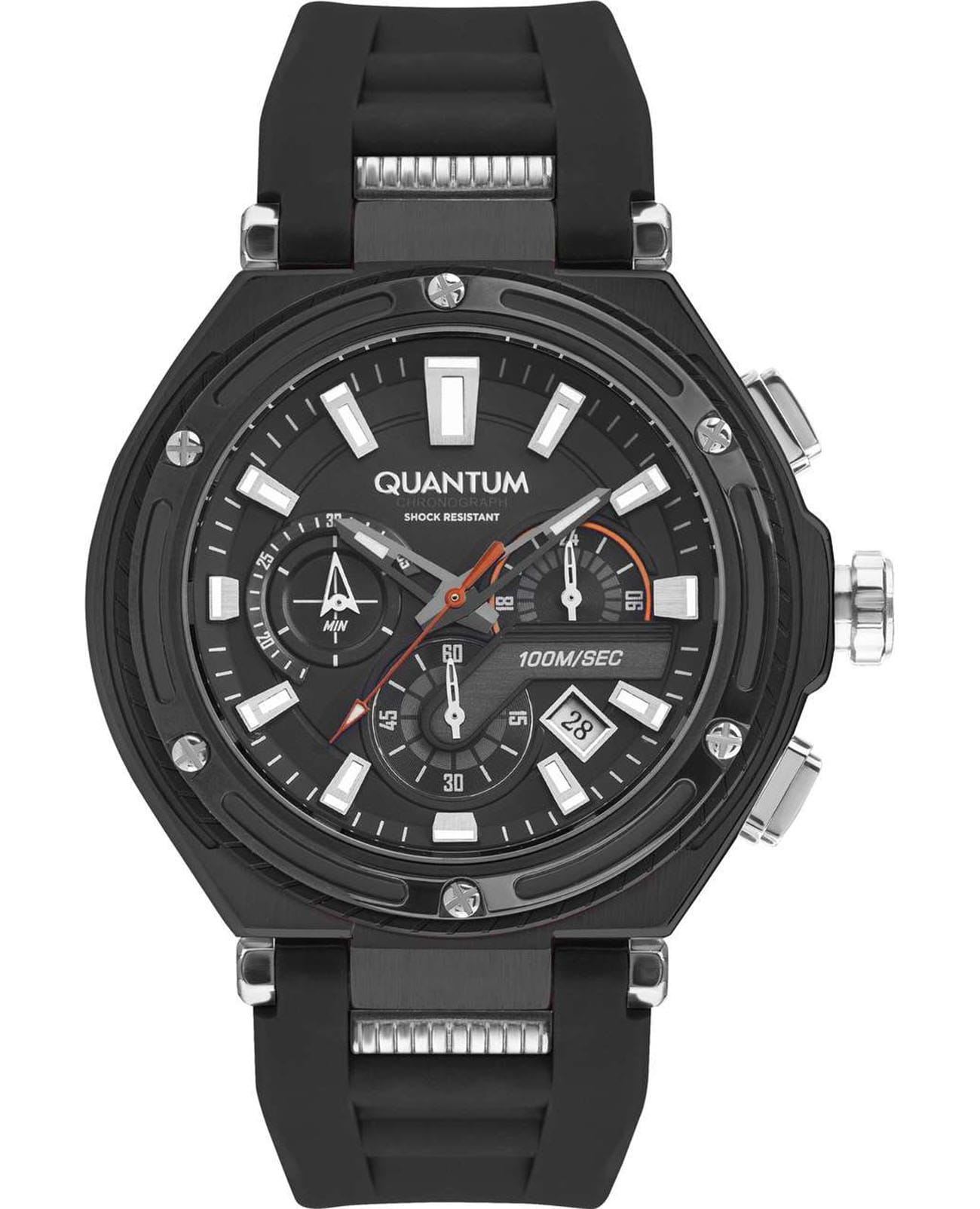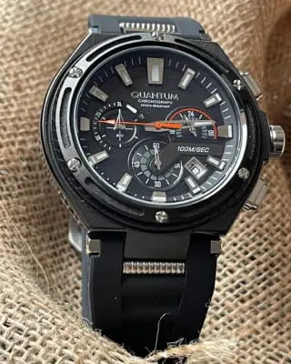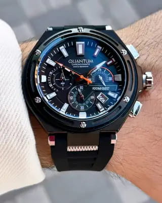 Мужские кварцевые часы-хронограф Quantum Hunter — это прочный и функциональный спортивный аксессуар. Корпус диаметром 50 мм выполнен из нержавеющей стали с PVD-покрытиемPVDУльтратонкое покрытие наносится в технике вакуумного напыления, сочетает в себе нитрид титана особой прочности со слоем золота или оксида хрома. Несёт в себе декоративную или защитную функцию. цвета чёрного золота. Циферблат чёрного цвета оформлен штрихами, стрелками и тремя субциферблатами хронографа, один из которых отображает время в 24-часовом формате. Окошко даты расположено в положении 5 часов. Циферблат защищён минеральным стекломМинеральное стеклоМинеральное стекло представляет собой искусственно выращенный минерал кварца. Такое стекло отличается особой устойчивостью к повреждениям и царапинам. Уступает по некоторым качествам сапфировому стеклу. с антибликовым покрытиемАнтибликовое покрытиеСлой оксида металла в 0,13-0,3 микрон, благодаря которому стекло часов не бликует и не отражает свет. Антибликовое покрытие уменьшает отражение света в 10 раз, обеспечивая отличную читаемость показателей циферблата.. Ударопрочный корпусУдаропрочный корпусМеханизм заключён в корпус, выполненный из современных материалов, устойчивых к ударам, механическим повреждениям и падению с высоты: инновационный пластик, карбон, нержавеющая сталь, титан. обеспечивает надёжную защиту механизма. Часы оснащены чёрным силиконовым ремешком на классической пряжке. Водонепроницаемость 100 м позволяет использовать часы для плавания и повседневного ношения. Идеальный выбор для тех, кто ценит турецкое качество и универсальный дизайн.