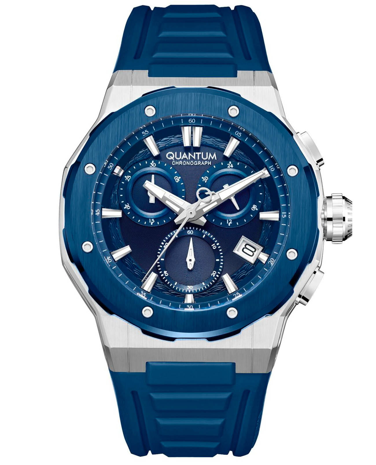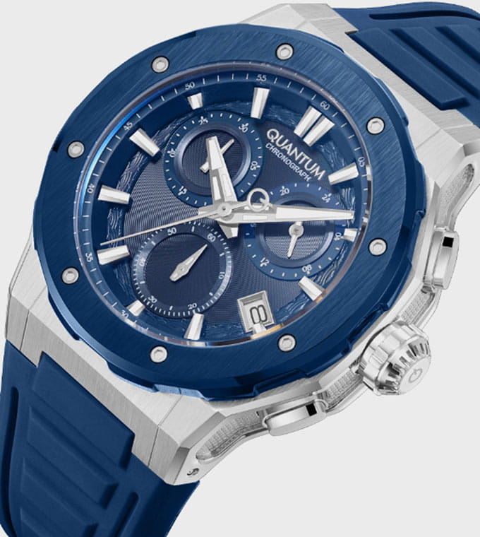 Мужские кварцевые часы Quantum из коллекции Hunter — круглый корпус размером 46 мм из нержавеющей стали, оснащённый функциями хронографаХронографФункция позволяет измерять отрезки времени с особой точностью: часы, минуты, секунды. Верным признаком хронографа является наличие на циферблате 3 дополнительных окошек-счётчиков., суточника и окошком даты. БезельБезельВнешний ободок, закрепляющий стекло. В спортивных часах так называется поворотное кольцо с делениями на циферблате, выполняет роль таймера – замеряет отрезки времени на шкале. Неподвижный безель – элемент декора. Однонаправленно вращающийся безель на дайверских часах позволяет фиксировать моменты погружения и выныривания на поверхность. из нержавеющей стали с PVD-покрытиемPVDУльтратонкое покрытие наносится в технике вакуумного напыления, сочетает в себе нитрид титана особой прочности со слоем золота или оксида хрома. Несёт в себе декоративную или защитную функцию.. Стекло — минеральноеМинеральное стеклоМинеральное стекло представляет собой искусственно выращенный минерал кварца. Такое стекло отличается особой устойчивостью к повреждениям и царапинам. Уступает по некоторым качествам сапфировому стеклу. с антибликовым покрытием. Механизм — японский кварцевый Seiko. Водонепроницаемость 100 м. Ремешок — синий силиконовый на стандартной застёжке. Идеальный выбор для тех, кто ценит турецкий дизайн и функциональный спортивный стиль.