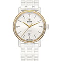 Женские механические швейцарские часы с автоподзаводом Rado Diamaster R14098727. Сапфировое стеклоСапфировое стеклоПрочный и надёжный материал из кристалла сапфира синтетического происхождения, характеризующийся особой твёрдостью и устойчивостью к царапинам и повреждениям. устойчивое к мелким механическим повреждениям. Корпус часов изготовлен из стали высокотехнологичной керамикиВысокотехнологичная керамикаИнновационный запатентованный Rado материал с гладкой или матовой поверхностью. Керамика за счёт кристаллической структуры обладает повышенной устойчивостью от возникновения царапин. Материал способен принимать температуру тела человека, обеспечивая невероятный комфорт при ношении.. БезельБезельВнешний ободок, закрепляющий стекло. В спортивных часах так называется поворотное кольцо с делениями на циферблате, выполняет роль таймера – замеряет отрезки времени на шкале. Неподвижный безель – элемент декора. Однонаправленно вращающийся безель на дайверских часах позволяет фиксировать моменты погружения и выныривания на поверхность. из стали с PVD-покрытиемPVDУльтратонкое покрытие наносится в технике вакуумного напыления, сочетает в себе нитрид титана особой прочности со слоем золота или оксида хрома. Несёт в себе декоративную или защитную функцию. и циферблат украшены бриллиантами. Окошко даты находится в положении 3 часа. Циферблат украшен бриллиантами. Класс водозащиты: 50 метров, позволит защитить корпус от случайных брызг или капель дождя. Браслет из высокотехнологичной керамикиВысокотехнологичная керамикаИнновационный запатентованный Rado материал с гладкой или матовой поверхностью. Керамика за счёт кристаллической структуры обладает повышенной устойчивостью от возникновения царапин. Материал способен принимать температуру тела человека, обеспечивая невероятный комфорт при ношении. на раскладной застёжкеРаскладная застёжкаТакой тип застёжки используется только на браслетах из металла. Она никогда не раскрывается полностью, происходит разделение на 2 и более частей. Раскладывающая застёжка снизит вероятность потери часов к минимуму..