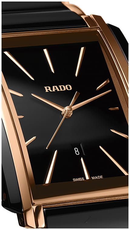 Наручные часы привлекают чёткими геометрическими формами, стильный прямоугольный циферблат с роскошным сиянием бриллиантов точно оценят любители классики и элегантности. Модель в шоколадном исполнении выполнена из нержавеющей стали со вставками из высокотехнологичной керамикиВысокотехнологичная керамикаИнновационный запатентованный Rado материал с гладкой или матовой поверхностью. Керамика за счёт кристаллической структуры обладает повышенной устойчивостью от возникновения царапин. Материал способен принимать температуру тела человека, обеспечивая невероятный комфорт при ношении. с PVD-покрытиемPVDУльтратонкое покрытие наносится в технике вакуумного напыления, сочетает в себе нитрид титана особой прочности со слоем золота или оксида хрома. Несёт в себе декоративную или защитную функцию.. За высокую точность хода отвечает кварцевый калибр ETA E61.111. Сапфировое стеклоСапфировое стеклоПрочный и надёжный материал из кристалла сапфира синтетического происхождения, характеризующийся особой твёрдостью и устойчивостью к царапинам и повреждениям.. Апертура даты.