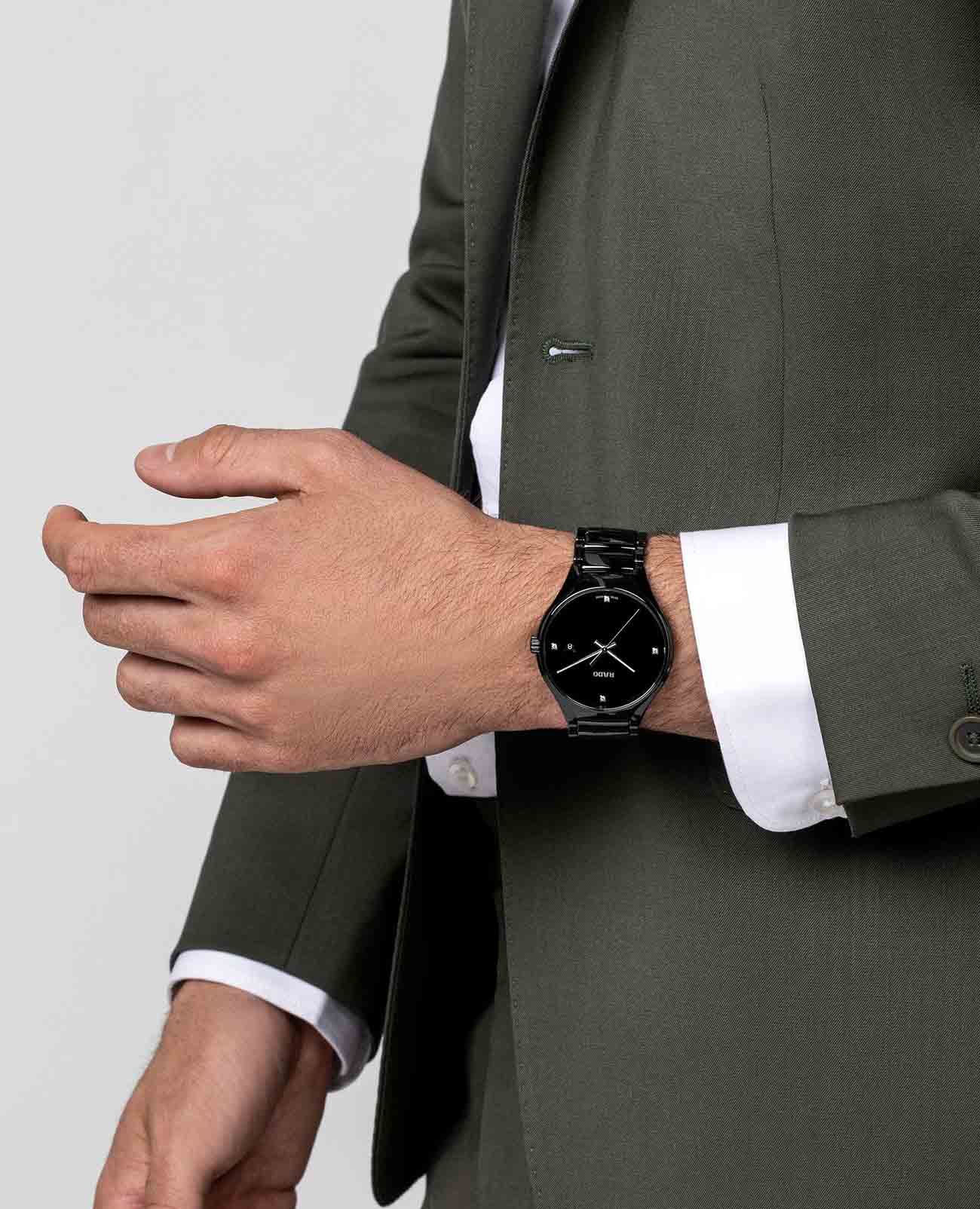 Корпус часов изготовлен из лёгкого и прочного титана, а также высокотехнологичной керамикиВысокотехнологичная керамикаИнновационный запатентованный Rado материал с гладкой или матовой поверхностью. Керамика за счёт кристаллической структуры обладает повышенной устойчивостью от возникновения царапин. Материал способен принимать температуру тела человека, обеспечивая невероятный комфорт при ношении., что обеспечивает их исключительную прочность и износоустойчивость. Такое сочетание материалов придаёт часам не только изысканную красоту, но и невероятную лёгкость, что делает их комфортными в носке.