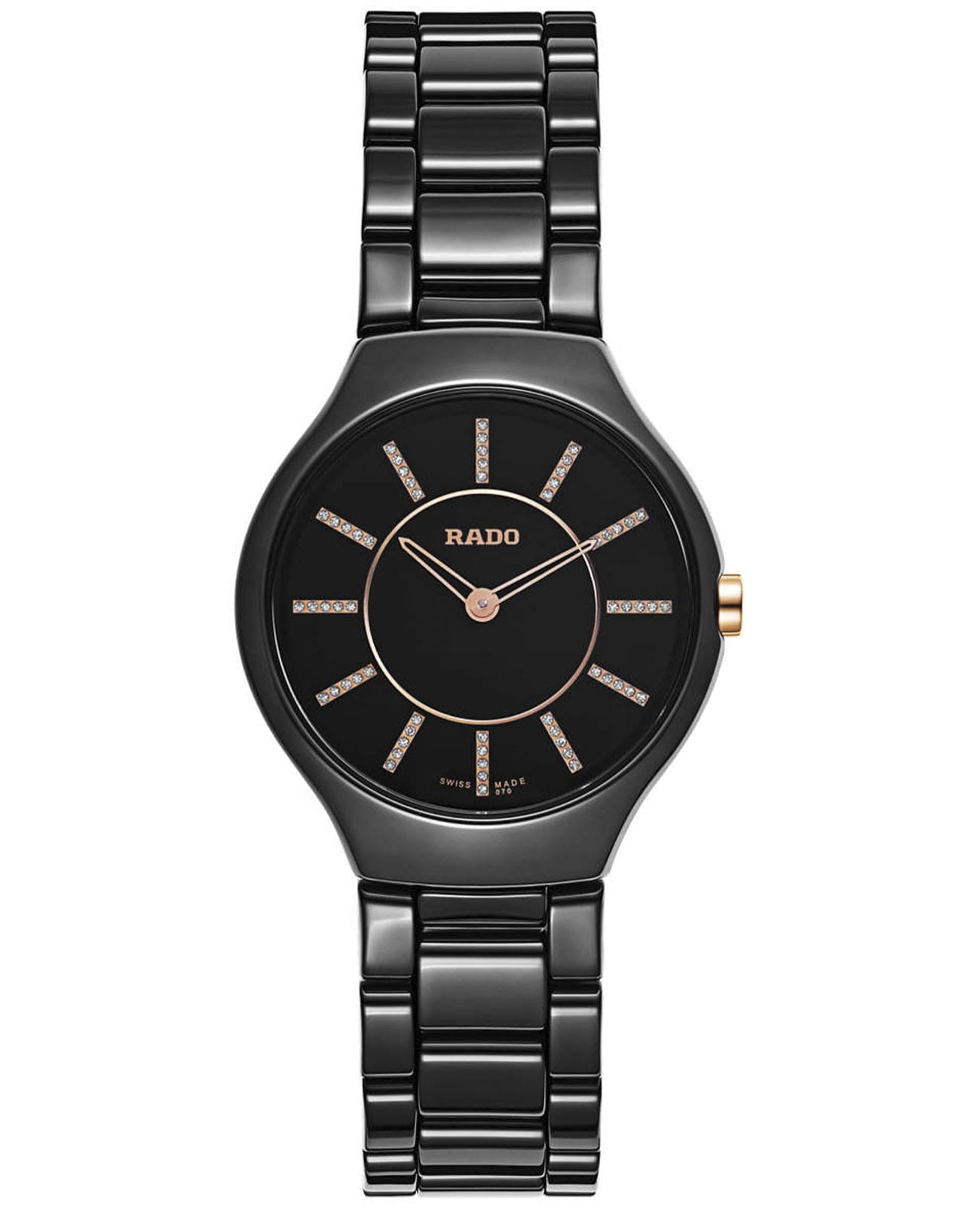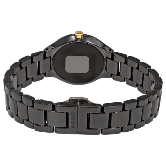 Швейцарские женские Rado True Thinline Diamonds R27742702, кварцевый механизм с высокой точностью. Сапфировое стеклоСапфировое стеклоПрочный и надёжный материал из кристалла сапфира синтетического происхождения, характеризующийся особой твёрдостью и устойчивостью к царапинам и повреждениям. устойчивое к появлению царапин, обладающее высокой прозрачностью. Корпус часов изготовлен из высокотехнологичной керамикиВысокотехнологичная керамикаИнновационный запатентованный Rado материал с гладкой или матовой поверхностью. Керамика за счёт кристаллической структуры обладает повышенной устойчивостью от возникновения царапин. Материал способен принимать температуру тела человека, обеспечивая невероятный комфорт при ношении.. Циферблат украшен бриллиантами. Класс водозащиты: 30 метров, позволит защитить корпус от случайных брызг или капель дождя. Керамический браслет на застёжке-бабочке с кнопкамиЗастёжка "бабочка"Такой вид застёжки дополняется предохранителями, помогающими избежать случайного раскрытия браслета. Обладают изящным исполнением. .