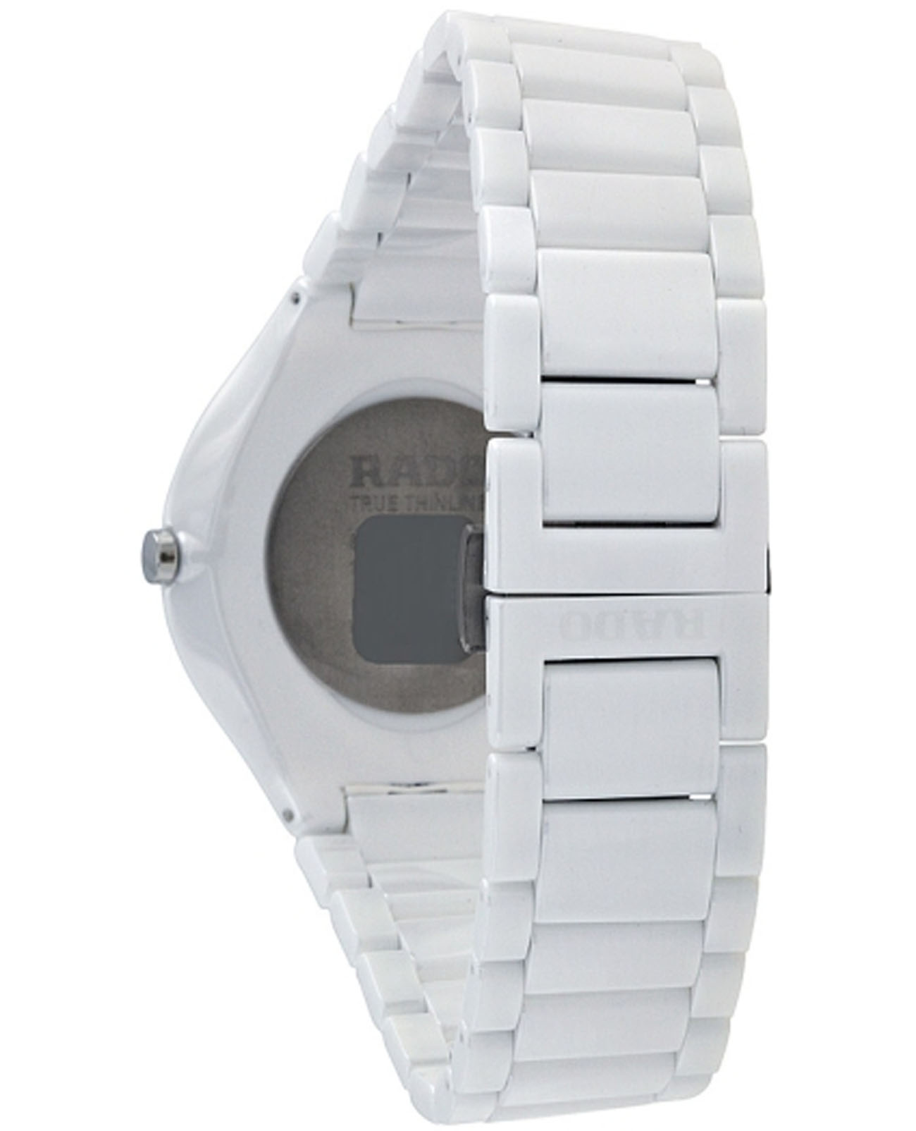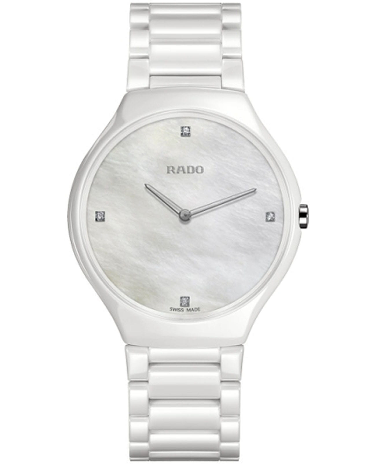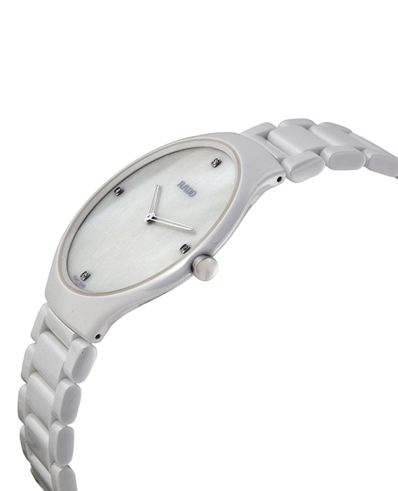 Швейцарские женские Rado True Thinline R27957902, кварцевый механизм с высокой точностью. Сапфировое стеклоСапфировое стеклоПрочный и надёжный материал из кристалла сапфира синтетического происхождения, характеризующийся особой твёрдостью и устойчивостью к царапинам и повреждениям. устойчивое к появлению царапин, обладающее высокой прозрачностью. Корпус часов изготовлен из высокотехнологичной керамикиВысокотехнологичная керамикаИнновационный запатентованный Rado материал с гладкой или матовой поверхностью. Керамика за счёт кристаллической структуры обладает повышенной устойчивостью от возникновения царапин. Материал способен принимать температуру тела человека, обеспечивая невероятный комфорт при ношении.. Циферблат украшен бриллиантами. Класс водозащиты: 30 метров, позволит защитить корпус от случайных брызг или капель дождя. Керамический браслет на застёжке-бабочке с кнопкамиЗастёжка "бабочка"Такой вид застёжки дополняется предохранителями, помогающими избежать случайного раскрытия браслета. Обладают изящным исполнением. .