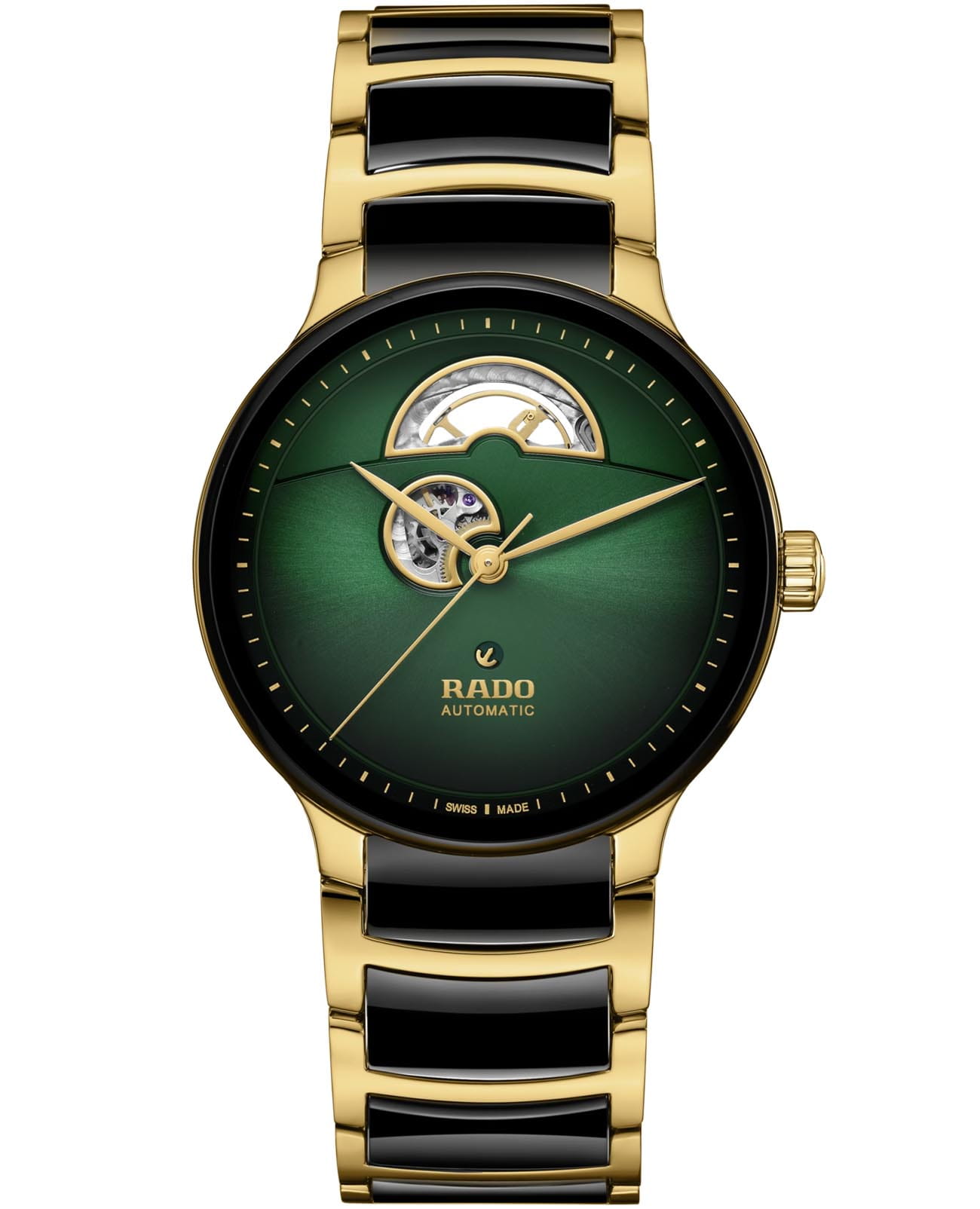 Швейцарские механические часы-скелетоны с автоматическим подзаводом Rado Centrix Automatic Open Heart R30008302. Корпус часов изготовлен из нержавеющей стали с PVD-покрытиемPVDУльтратонкое покрытие наносится в технике вакуумного напыления, сочетает в себе нитрид титана особой прочности со слоем золота или оксида хрома. Несёт в себе декоративную или защитную функцию.. Браслет из стали и высокотехнологичной керамикиВысокотехнологичная керамикаИнновационный запатентованный Rado материал с гладкой или матовой поверхностью. Керамика за счёт кристаллической структуры обладает повышенной устойчивостью от возникновения царапин. Материал способен принимать температуру тела человека, обеспечивая невероятный комфорт при ношении. на раскладной застёжкеРаскладная застёжкаТакой тип застёжки используется только на браслетах из металла. Она никогда не раскрывается полностью, происходит разделение на 2 и более частей. Раскладывающая застёжка снизит вероятность потери часов к минимуму.. Сапфировое стеклоСапфировое стеклоПрочный и надёжный материал из кристалла сапфира синтетического происхождения, характеризующийся особой твёрдостью и устойчивостью к царапинам и повреждениям. устойчивое к мелким механическим повреждениям. Класс водозащиты: 50 метров, позволит защитить корпус от случайных брызг или капель дождя.
