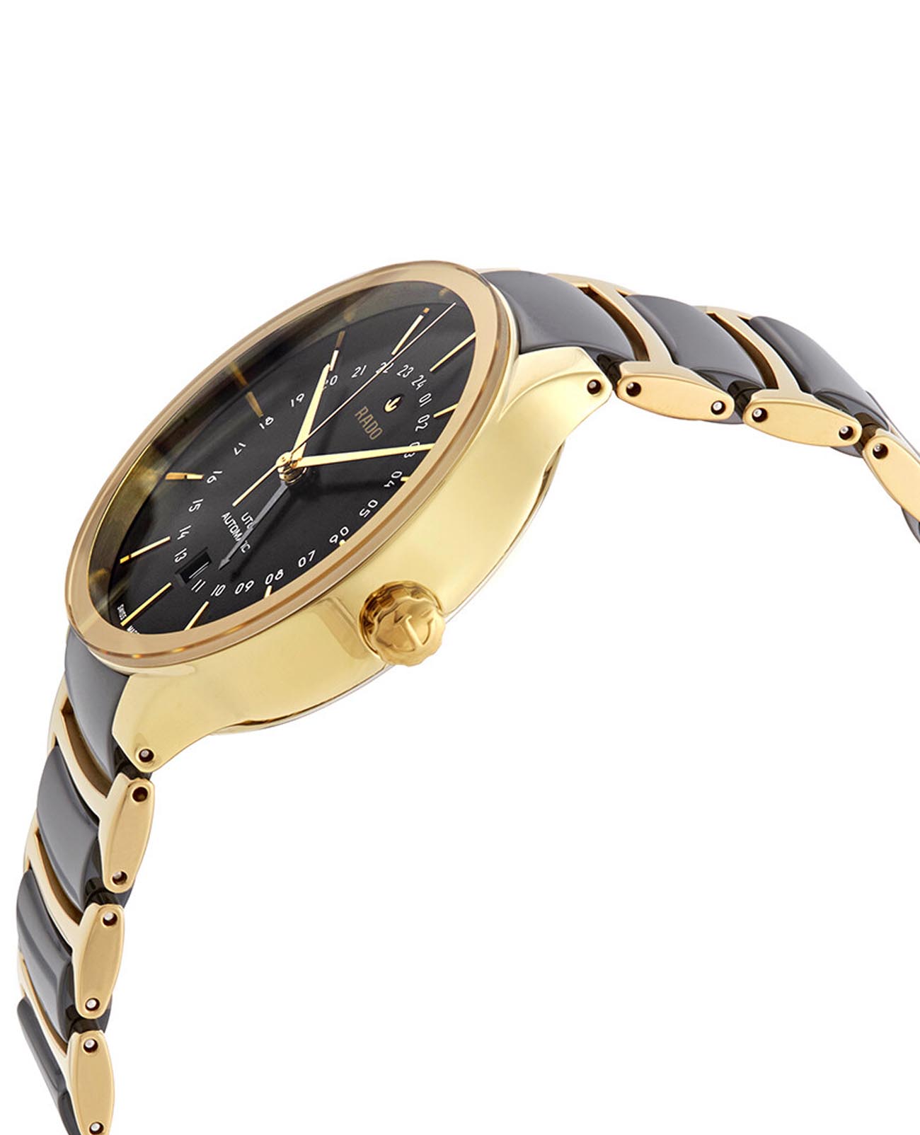 Мужские швейцарские механические часы Rado Centrix Automatic R30163162. Сапфировое стеклоСапфировое стеклоПрочный и надёжный материал из кристалла сапфира синтетического происхождения, характеризующийся особой твёрдостью и устойчивостью к царапинам и повреждениям. устойчивое к мелким механическим повреждениям. Корпус часов изготовлен из нержавеющей стали с PVD-покрытиемPVDУльтратонкое покрытие наносится в технике вакуумного напыления, сочетает в себе нитрид титана особой прочности со слоем золота или оксида хрома. Несёт в себе декоративную или защитную функцию.. Окошко даты находится в положении 6 часов. Прозрачная задняя крышка. Класс водозащиты: 30 метров, позволит защитить корпус от случайных брызг или капель дождя. Браслет из нержавеющей стали с частичным PVD-покрытиемPVDУльтратонкое покрытие наносится в технике вакуумного напыления, сочетает в себе нитрид титана особой прочности со слоем золота или оксида хрома. Несёт в себе декоративную или защитную функцию. и керамики на раскладной застёжкеРаскладная застёжкаТакой тип застёжки используется только на браслетах из металла. Она никогда не раскрывается полностью, происходит разделение на 2 и более частей. Раскладывающая застёжка снизит вероятность потери часов к минимуму..