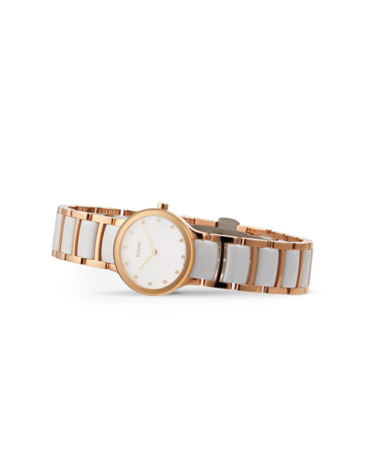 Женские швейцарские часы с кварцевым механизмом Rado Centrix R30186912, кварцевый механизм с высокой точностью. Сапфировое стеклоСапфировое стеклоПрочный и надёжный материал из кристалла сапфира синтетического происхождения, характеризующийся особой твёрдостью и устойчивостью к царапинам и повреждениям. устойчивое к мелким механическим повреждениям. Корпус часов изготовлен из нержавеющей стали с PVD-покрытиемPVDУльтратонкое покрытие наносится в технике вакуумного напыления, сочетает в себе нитрид титана особой прочности со слоем золота или оксида хрома. Несёт в себе декоративную или защитную функцию.. Циферблат украшен бриллиантами. Класс водозащиты: 30 метров, позволит защитить корпус от случайных брызг или капель дождя. Стальной браслет с частичным PVD-покрытиемPVDУльтратонкое покрытие наносится в технике вакуумного напыления, сочетает в себе нитрид титана особой прочности со слоем золота или оксида хрома. Несёт в себе декоративную или защитную функцию. и керамики на раскладной застёжкеРаскладная застёжкаТакой тип застёжки используется только на браслетах из металла. Она никогда не раскрывается полностью, происходит разделение на 2 и более частей. Раскладывающая застёжка снизит вероятность потери часов к минимуму..