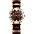 Женские швейцарские часы с кварцевым механизмом Rado Centrix R30218702, кварцевый механизм с высокой точностью. Сапфировое стеклоСапфировое стеклоПрочный и надёжный материал из кристалла сапфира синтетического происхождения, характеризующийся особой твёрдостью и устойчивостью к царапинам и повреждениям. устойчивое к мелким механическим повреждениям. Корпус часов изготовлен из нержавеющей стали и керамики. БезельБезельВнешний ободок, закрепляющий стекло. В спортивных часах так называется поворотное кольцо с делениями на циферблате, выполняет роль таймера – замеряет отрезки времени на шкале. Неподвижный безель – элемент декора. Однонаправленно вращающийся безель на дайверских часах позволяет фиксировать моменты погружения и выныривания на поверхность. с PVD-покрытиемPVDУльтратонкое покрытие наносится в технике вакуумного напыления, сочетает в себе нитрид титана особой прочности со слоем золота или оксида хрома. Несёт в себе декоративную или защитную функцию. украшен бриллиантами. Класс водозащиты: 30 метров, позволит защитить корпус от случайных брызг или капель дождя. Стальной браслет с частичным PVD-покрытиемPVDУльтратонкое покрытие наносится в технике вакуумного напыления, сочетает в себе нитрид титана особой прочности со слоем золота или оксида хрома. Несёт в себе декоративную или защитную функцию. и керамики на раскладной застёжкеРаскладная застёжкаТакой тип застёжки используется только на браслетах из металла. Она никогда не раскрывается полностью, происходит разделение на 2 и более частей. Раскладывающая застёжка снизит вероятность потери часов к минимуму..