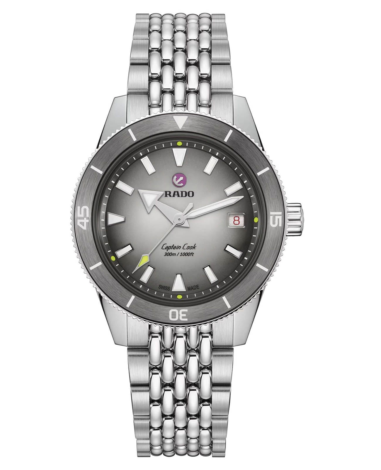 Мужские механические часы с автоподзаводом Rado Captain Cook X Tennis Limited Edition — это дань уважения 40-летнему партнерству бренда с теннисом. Лимитированная серия из 1985 экземпляров отсылает к первой спонсорской поддержке Rado на Swiss Open в Гштааде в 1985 году. Корпус диаметром 39 мм и толщиной 12 мм выполнен из полированной нержавеющей стали. БезельБезельВнешний ободок, закрепляющий стекло. В спортивных часах так называется поворотное кольцо с делениями на циферблате, выполняет роль таймера – замеряет отрезки времени на шкале. Неподвижный безель – элемент декора. Однонаправленно вращающийся безель на дайверских часах позволяет фиксировать моменты погружения и выныривания на поверхность. — вращающийся, стальной, с инкрустированным кольцом из высокотехнологичной плазменной керамикиВысокотехнологичная плазменная керамикаИнновационный материал, технология запатентована. Выплавление керамики осуществляется в печи при 20 000 °C, белоснежный материал под воздействием ультравысокой температуры приобретает уникальный блеск, присущий металлам., на котором нанесены метки, цифры и треугольник с белым люминесцентным покрытиемЛюминесцентное покрытиеПозволяет считывать показания времени в темноте. Производители наносят на стрелки, часовые индексы, безель или поверхность циферблата светонакопительный состав, дающий холодное свечение. Super-Luminova®. Циферблат серого цвета с градиентом от тёмного к светлому оформлен накладными индексами цвета родия и стрелками с люминесцентным покрытиемЛюминесцентное покрытиеПозволяет считывать показания времени в темноте. Производители наносят на стрелки, часовые индексы, безель или поверхность циферблата светонакопительный состав, дающий холодное свечение. Super-Luminova®. На ободе — жёлтые люминесцентные точки в положениях 3, 6, 8 и 12 часов, символизирующие счёт в теннисе (15, 30, 40, гейм). Секундная стрелка с тёмно-жёлтым покрытием Super-Luminova®. Циферблат защищён сапфировым стекломСапфировое стеклоПрочный и надёжный материал из кристалла сапфира синтетического происхождения, характеризующийся особой твёрдостью и устойчивостью к царапинам и повреждениям. с антибликовым покрытиемАнтибликовое покрытиеСлой оксида металла в 0,13-0,3 микрон, благодаря которому стекло часов не бликует и не отражает свет. Антибликовое покрытие уменьшает отражение света в 10 раз, обеспечивая отличную читаемость показателей циферблата. с обеих сторон. Механизм — автоматический калибр R763 с антимагнитной пружиной Nivachron™Nivachron™Специально разработанный инновационный сплав Nivachron™ повышает устойчивость часов к воздействию магнитных полей., отрегулированный в пяти положениях, с запасом хода 80 часов. Окошко даты расположено в положении 3 часов. Часы оснащены стальным браслетом «рисовый узор» с трёхсекционной застёжкой и системой быстрой смены EasyClip. В комплекте — три текстильных ремешка в стиле NATO (синий, зелёный, оранжевый) с пряжками из нержавеющей стали. Водонепроницаемость 300 м позволяет использовать часы для профессионального плавания и дайвинга. Гарантия — 2 года. Идеальный выбор для ценителей спортивного стиля, точности и эксклюзивности.