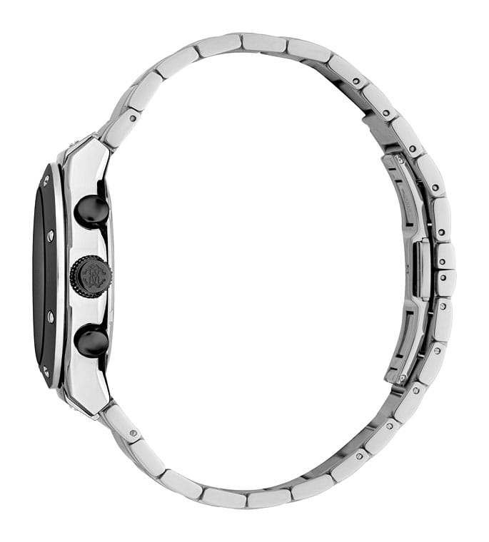 ROBERTO CAVALLI Ottimale RC5G045M0075 — стильные итальянские часы с функцией хронографаХронографФункция позволяет измерять отрезки времени с особой точностью: часы, минуты, секунды. Верным признаком хронографа является наличие на циферблате 3 дополнительных окошек-счётчиков., которые сочетают в себе элегантность и современный функционал. Круглый корпус диаметром 42 мм выполнен из нержавеющей стали, толщина корпуса составляет 12 мм, что придает модели выразительный внешний вид и надежную защиту от внешних воздействий. Часы оснащены кварцевым механизмом, также обладают функцией отображения даты и 24-часовой указатель времени, что делает их удобными для ежедневного использования. Минеральное стеклоМинеральное стеклоМинеральное стекло представляет собой искусственно выращенный минерал кварца. Такое стекло отличается особой устойчивостью к повреждениям и царапинам. Уступает по некоторым качествам сапфировому стеклу. защищает часы от царапин. Водозащита 100 метров, позволит плавать, нырять и заниматься другими водными видами спорта. Неподвижный безельБезельВнешний ободок, закрепляющий стекло. В спортивных часах так называется поворотное кольцо с делениями на циферблате, выполняет роль таймера – замеряет отрезки времени на шкале. Неподвижный безель – элемент декора. Однонаправленно вращающийся безель на дайверских часах позволяет фиксировать моменты погружения и выныривания на поверхность. с PVD-покрытиемPVDУльтратонкое покрытие наносится в технике вакуумного напыления, сочетает в себе нитрид титана особой прочности со слоем золота или оксида хрома. Несёт в себе декоративную или защитную функцию.. Стальной браслет на застёжке-бабочке с кнопкамиЗастёжка "бабочка"Такой вид застёжки дополняется предохранителями, помогающими избежать случайного раскрытия браслета. Обладают изящным исполнением. обеспечивает комфортное ношение. Стрелки с люминесцентным покрытиемЛюминесцентное покрытиеПозволяет считывать показания времени в темноте. Производители наносят на стрелки, часовые индексы, безель или поверхность циферблата светонакопительный состав, дающий холодное свечение. обеспечивают отличную читаемость в любое время суток.