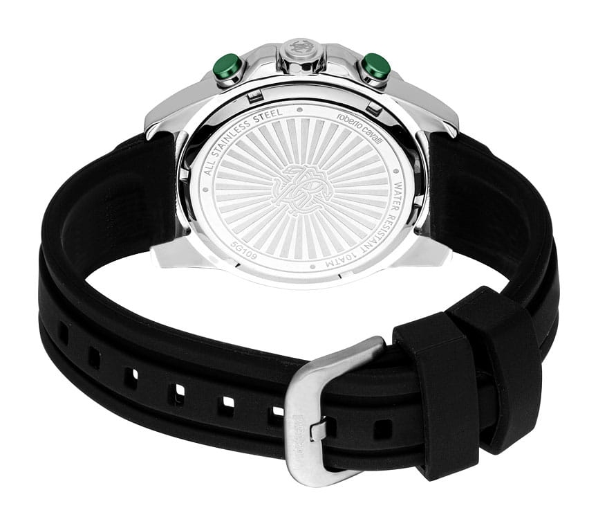 ROBERTO CAVALLI Uomo Sport III RC5G109P0015 — стильные итальянские часы-хронографХронографФункция позволяет измерять отрезки времени с особой точностью: часы, минуты, секунды. Верным признаком хронографа является наличие на циферблате 3 дополнительных окошек-счётчиков. сочетающие в себе элегантность и современный функционал. Корпус диаметром 42 мм выполнен из нержавеющей стали, толщина корпуса составляет 9 мм, что придает модели выразительный внешний вид и надежную защиту от внешних воздействий. Циферблат, искусно оформленный фирменными элементами Roberto Cavalli, притягивает взгляд и подчеркивает ваш безупречный вкус. Часы оснащены кварцевым механизмом, также обладают функцией отображения даты, что делает их удобными для ежедневного использования. Минеральное стеклоМинеральное стеклоМинеральное стекло представляет собой искусственно выращенный минерал кварца. Такое стекло отличается особой устойчивостью к повреждениям и царапинам. Уступает по некоторым качествам сапфировому стеклу. защищает часы от царапин. Водозащита 100 метров позволит плавать, нырять и заниматься другими водными видами спорта. Силиконовый ремешок на стандартной застёжке обеспечивает комфортное ношение. Стрелки и метки с люминесцентным покрытиемЛюминесцентное покрытиеПозволяет считывать показания времени в темноте. Производители наносят на стрелки, часовые индексы, безель или поверхность циферблата светонакопительный состав, дающий холодное свечение. обеспечивают отличную читаемость в любое время суток.