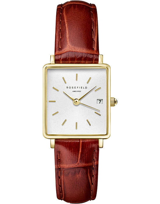 Часы Rosefield Boxy XS Brown Leather (модель QWBLG-Q55) — это элегантный женский аксессуар, сочетающий классический дизайн и современные тенденции. Корпус квадратной формы размером 22 x 24 мм выполнен из латуни с PVD-покрытиемPVDУльтратонкое покрытие наносится в технике вакуумного напыления, сочетает в себе нитрид титана особой прочности со слоем золота или оксида хрома. Несёт в себе декоративную или защитную функцию., что придаёт часам утончённый и изысканный вид. Белый циферблат с золотистыми часовыми метками и стрелками обеспечивает отличную читаемость и дополнен функцией отображения даты в положении "3 часа". Циферблат защищён минеральным стекломМинеральное стеклоМинеральное стекло представляет собой искусственно выращенный минерал кварца. Такое стекло отличается особой устойчивостью к повреждениям и царапинам. Уступает по некоторым качествам сапфировому стеклу., устойчивым к царапинам.