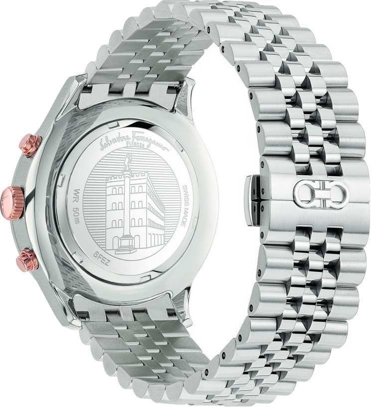 Мужские итальянские часы с хронографом Salvatore Ferragamo chic SFEZ00120, кварцевый механизм с высокой точностью. Сапфировое стекло устойчивое к появлению царапин, обладающее высокой прозрачностью. Класс водозащиты: 50 метров, позволит защитить корпус от случайных брызг или капель дождя. Корпус часов изготовлен из стали, цвета.